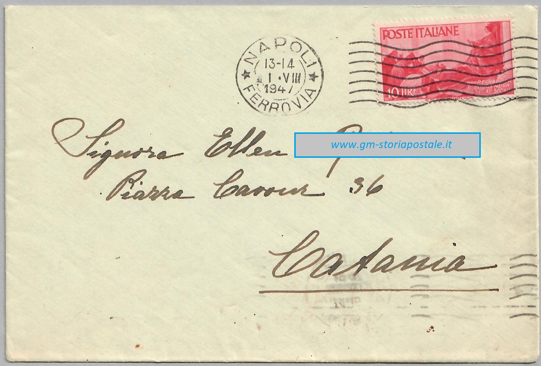 Tra il 1° agosto 1947 ed il 10 agosto 1948 la tariffa per affrancare una lettera primo porto era di 10 lire. L’esemplare sotto riportato fu spedito da Napoli il 1° agosto 1947, primo giorno della nuova tariffa, per Catania, dove giunse il giorno successivo.