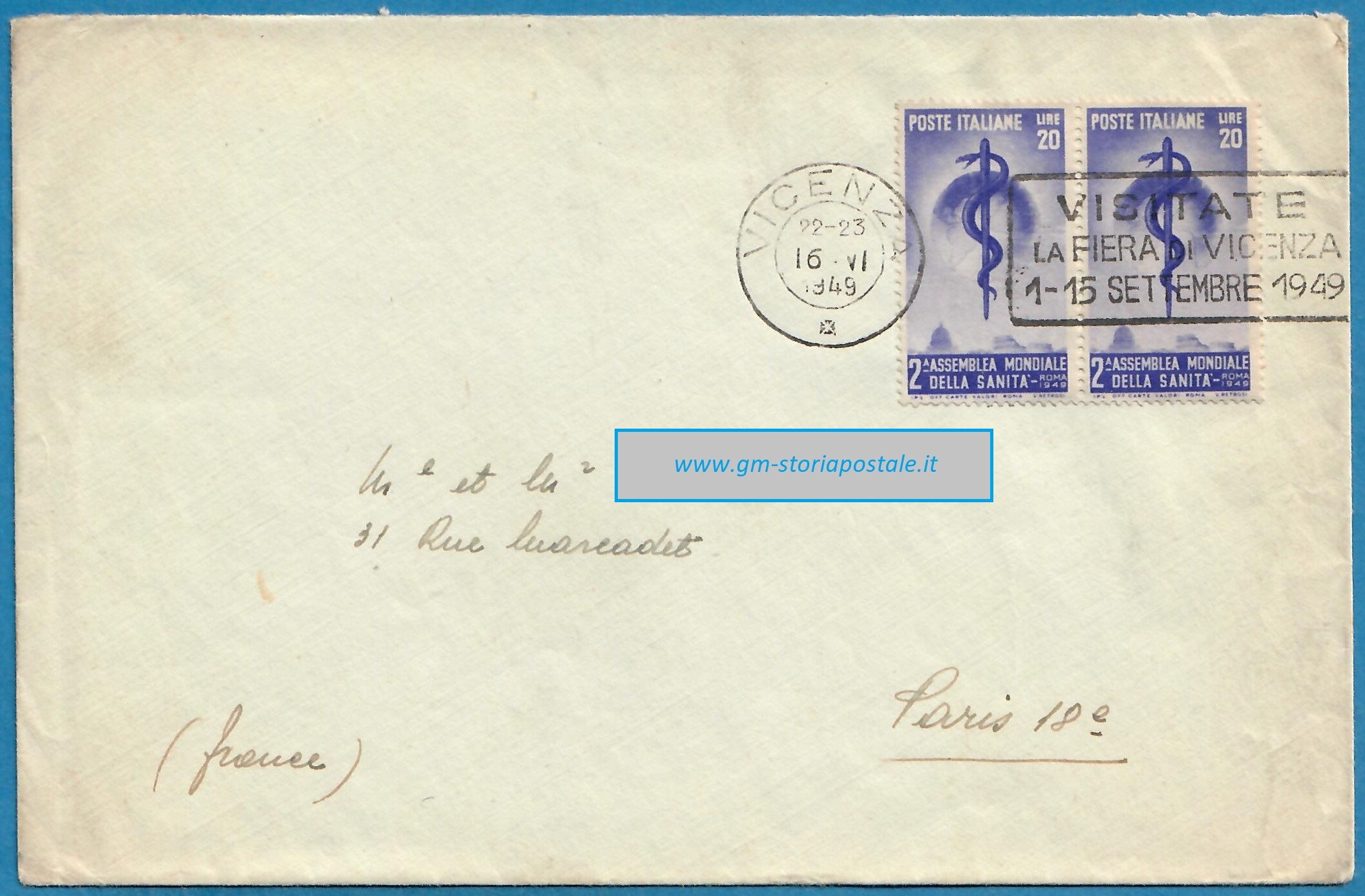Tra l’11 agosto 1948 ed il 31 dicembre 1949 la lettera primo porto per l’estero si affrancava con 40 lire. L’esemplare sotto riportato fu spedito da Vicenza (annullo con targhetta) il 16 giugno 1949 per la Francia. All’epoca non era ancora in vigore la convenzione che permetteva di inviare lettere in Francia alla medesima tariffa per l’interno; tale convenzione sarebbe entrata in vigore il 1° giugno 1950.