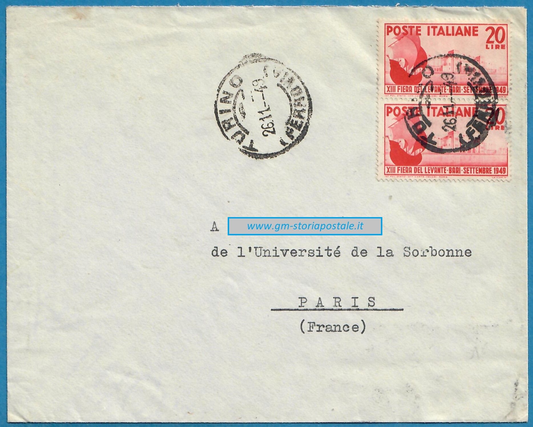 Tra l’11 agosto 1948 ed il 31 dicembre 1949 la lettera primo porto per l’estero si affrancava con 40 lire. L’esemplare sotto riportato fu spedito da Torino il 26 novembre 1949 per la Francia. All’epoca non era ancora in vigore la convenzione che permetteva di inviare lettere in Francia alla medesima tariffa per l’interno; tale convenzione sarebbe entrata in vigore il 1° giugno 1950.