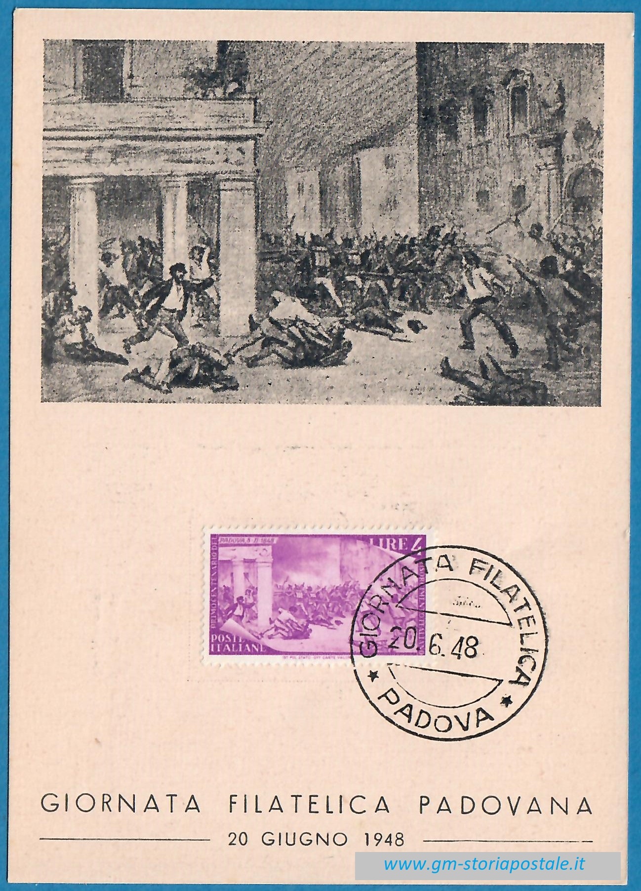 Il soggetto del francobollo rappresenta l’insurrezione del 1848 nel centro di Padova: sulla destra dell’immagine si vede il caffé Pedrocchi, centro degli scontri e luogo simbolo dei moti rivoluzionari. Il soggetto del francobollo fu quindi scelto anche per la cartolina commemorativa dedicata alla Giornata Filatelica Padovana del 1948, dove il 4 lire Risorgimento fu applicato ed annullato con il bollo speciale in uso.