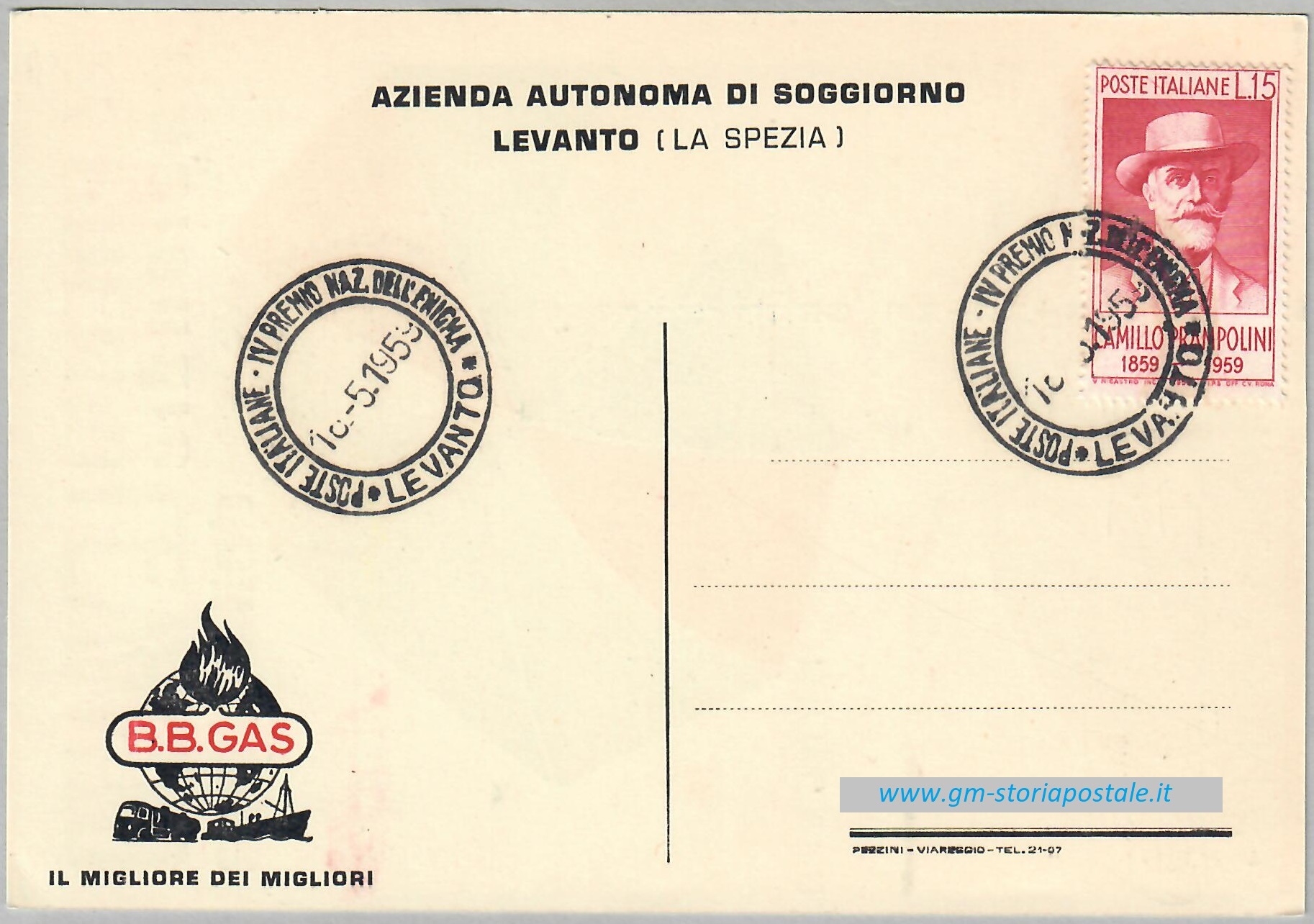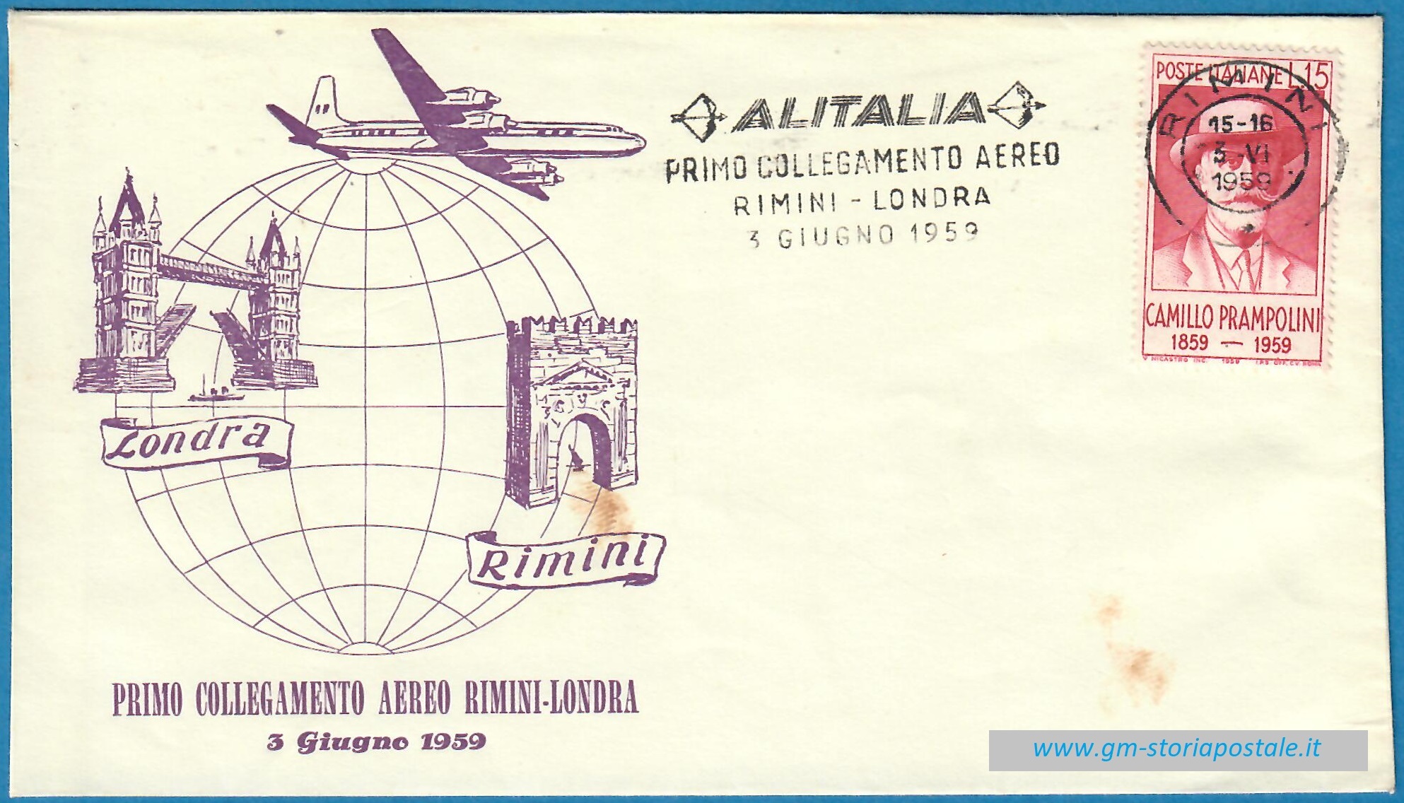 Nella busta non viaggiata sotto riportata il francobollo fu annullato con la targhetta in uso a Rimini in occasione del primo volo Alitalia Rimini Londra, il 3 giugno 1959.