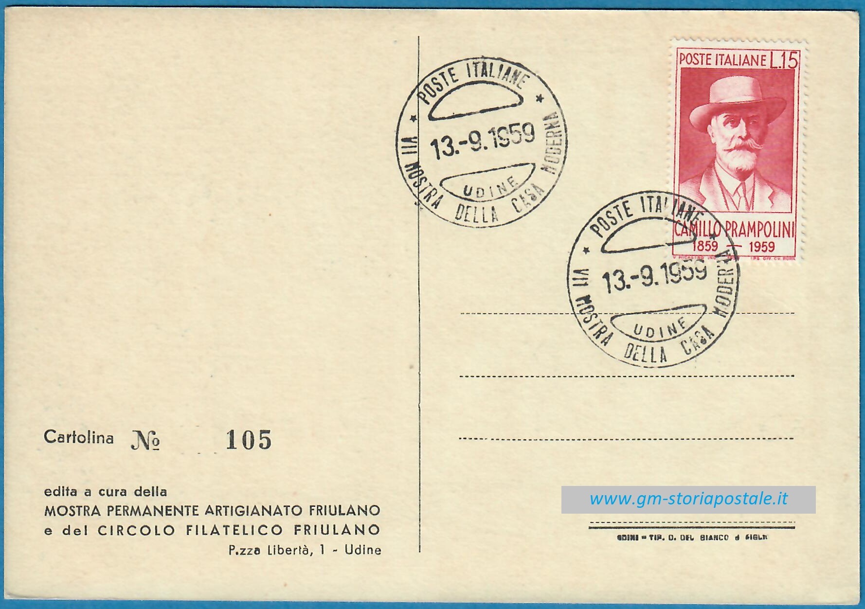 Tra il 1° ottobre 1957 ed il 31 luglio 1965 la tariffa per affrancare una cartolina illustrata con testo inferiore alle 5 parole di convenevoli era di 15 lire. L’esemplare sotto riportato fu spedito da Modena il 3 luglio 1959 per Reggio Emilia.