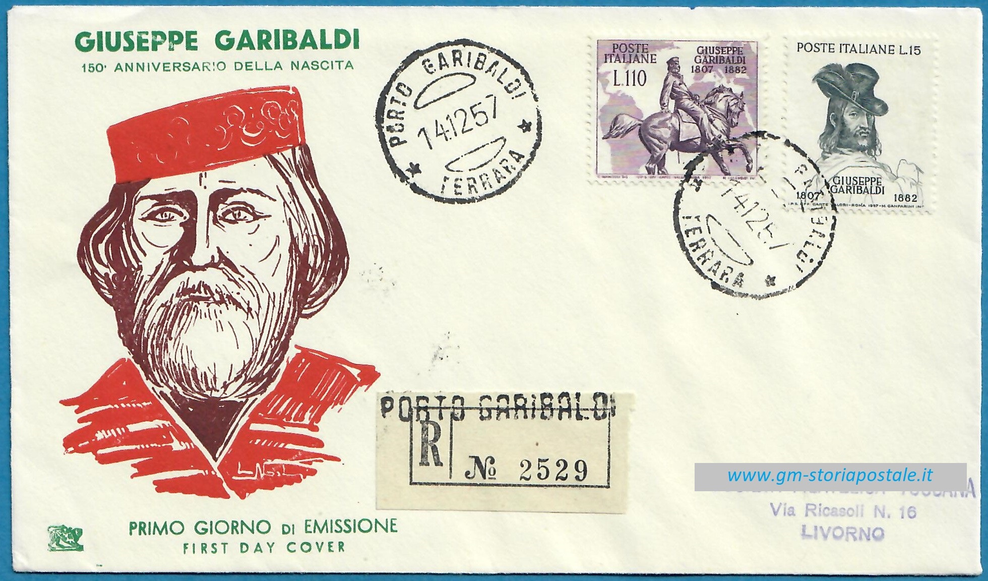 Il francobollo commemorativo da 15 lire della serie dedicata al 150° anniversario della nascita di Giuseppe Garibaldi fu emesso il 14 dicembre 1957 e restò valido fino al 31 dicembre 1958, per un totale di un anno.  In occasione dell’emissione del francobollo non risultano in uso dei bolli speciali; le buste primo giorno si possono reperire con l’annullo di Porto Garibaldi, località precedentemente nota come Magnavacca e poi ribattezzata Porto Garibaldi in onore dell’eroe che lì fu salvato quando ricercato dagli Austriaci nel 1849.