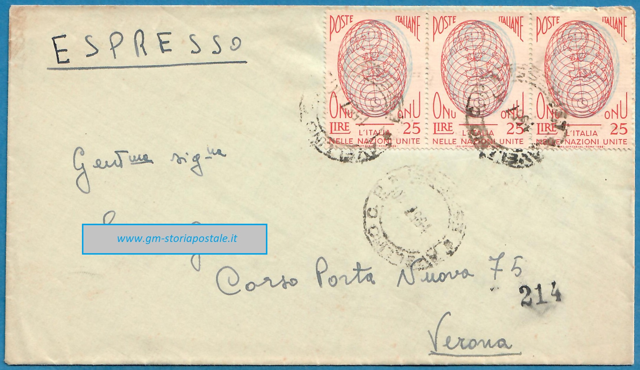 Tra il 1° agosto 1951 ed il 30 settembre 1957 la soprattassa per il recapito espresso ammontava a 50 lire: vi fu quindi un periodo in cui la lettera primo porto da recapitarsi per espresso si affrancava con 75 lire. L’esemplare sotto riportato fu spedito da Avellino il 1° maggio 1957 per Verona, dove giunse il giorno successivo.