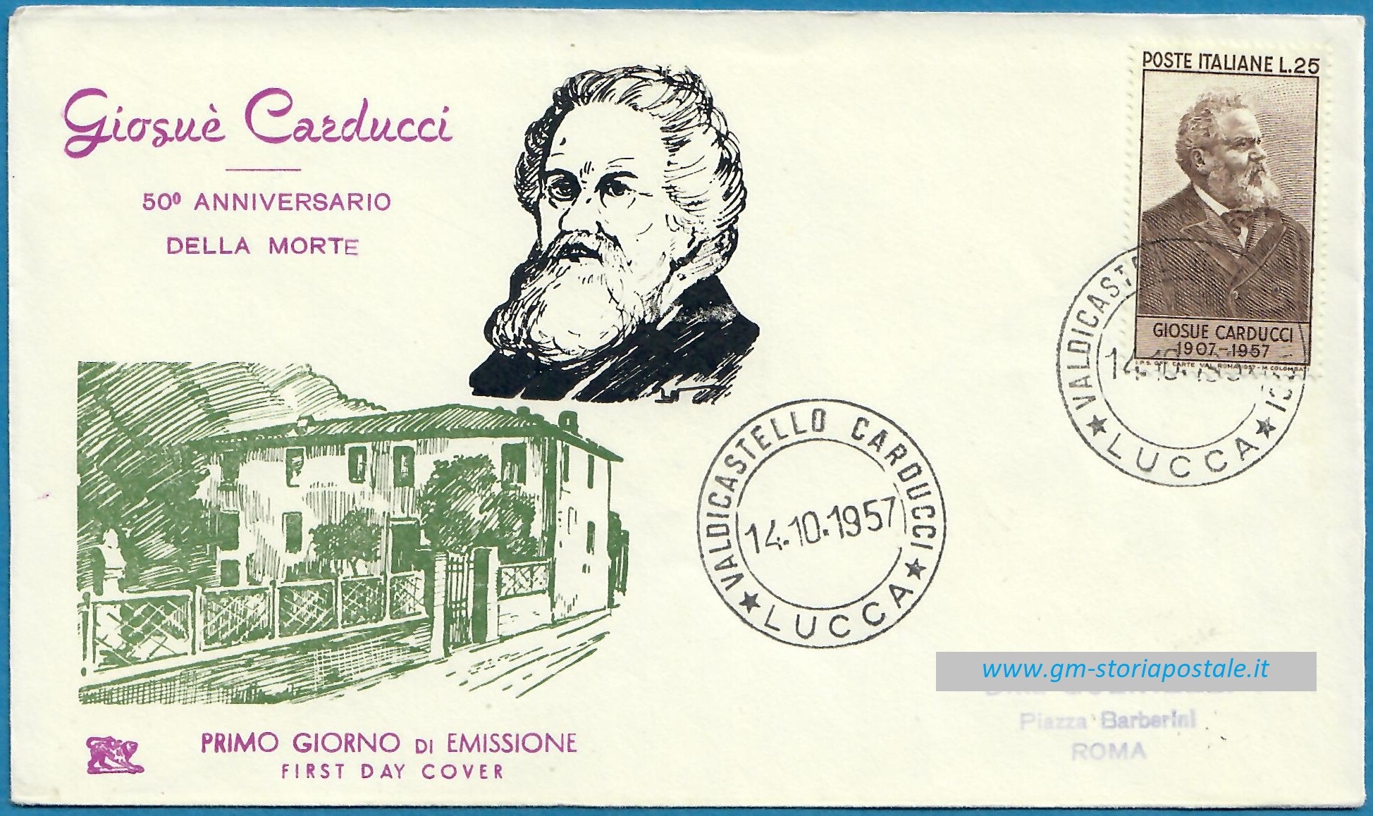 Il francobollo commemorativo da 25 lire dedicato al cinquantenario della morte di Giosuè Carducci fu emesso il 14 ottobre 1957 e restò valido fino al 31 dicembre 1958 per un totale di un anno e due mesi. In occasione dell’emissione del francobollo non risultano in uso dei bolli speciali; le buste primo giorno si possono reperire con l’annullo di Valdicastello, frazione di Pietrasanta e luogo natale del poeta.
