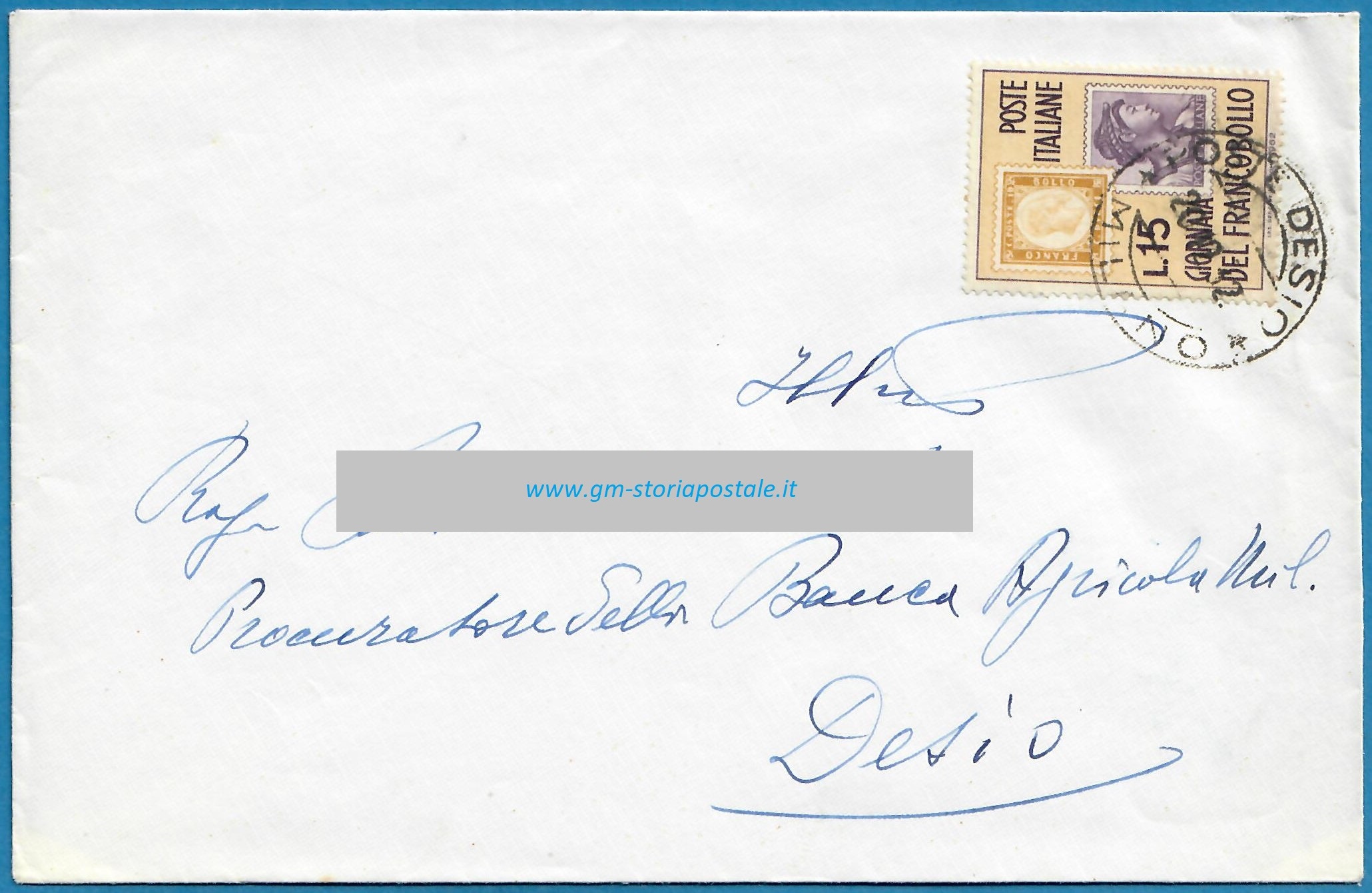 Tra il 1° ottobre 1957 ed il 31 luglio 1965 anche la tariffa per affrancare biglietti da visita o partecipazioni era di 15 lire. L’esemplare sotto riportato fu spedito da Desio il 20 dicembre 1962 per la medesima località.
