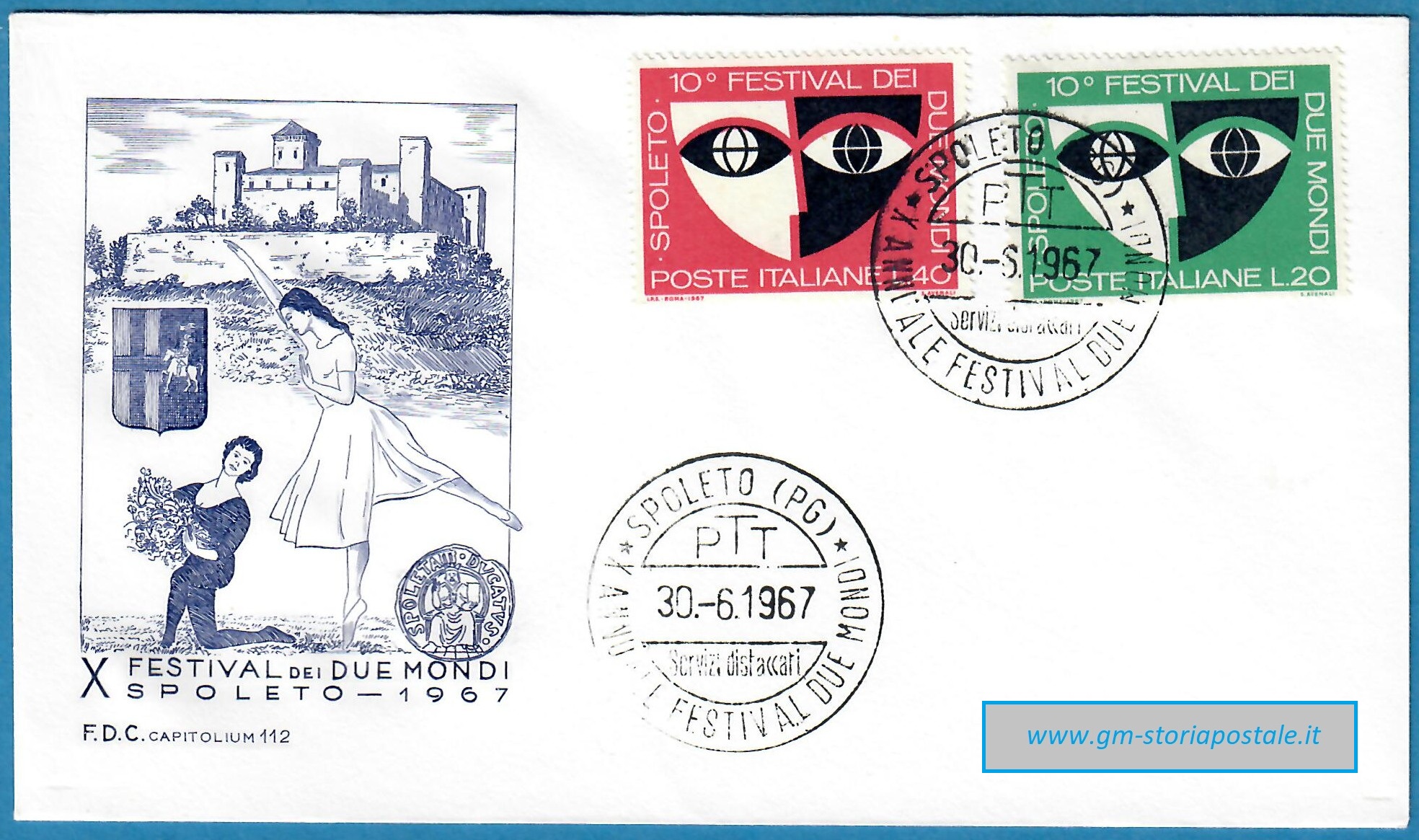 Il francobollo commemorativo da 20 lire della serie dedicata al 10° Festival dei Due Mondi fu emesso il 30 giugno 1967 con validità permanente. In occasione dell’emissione fu in uso a Spoleto un bollo speciale.