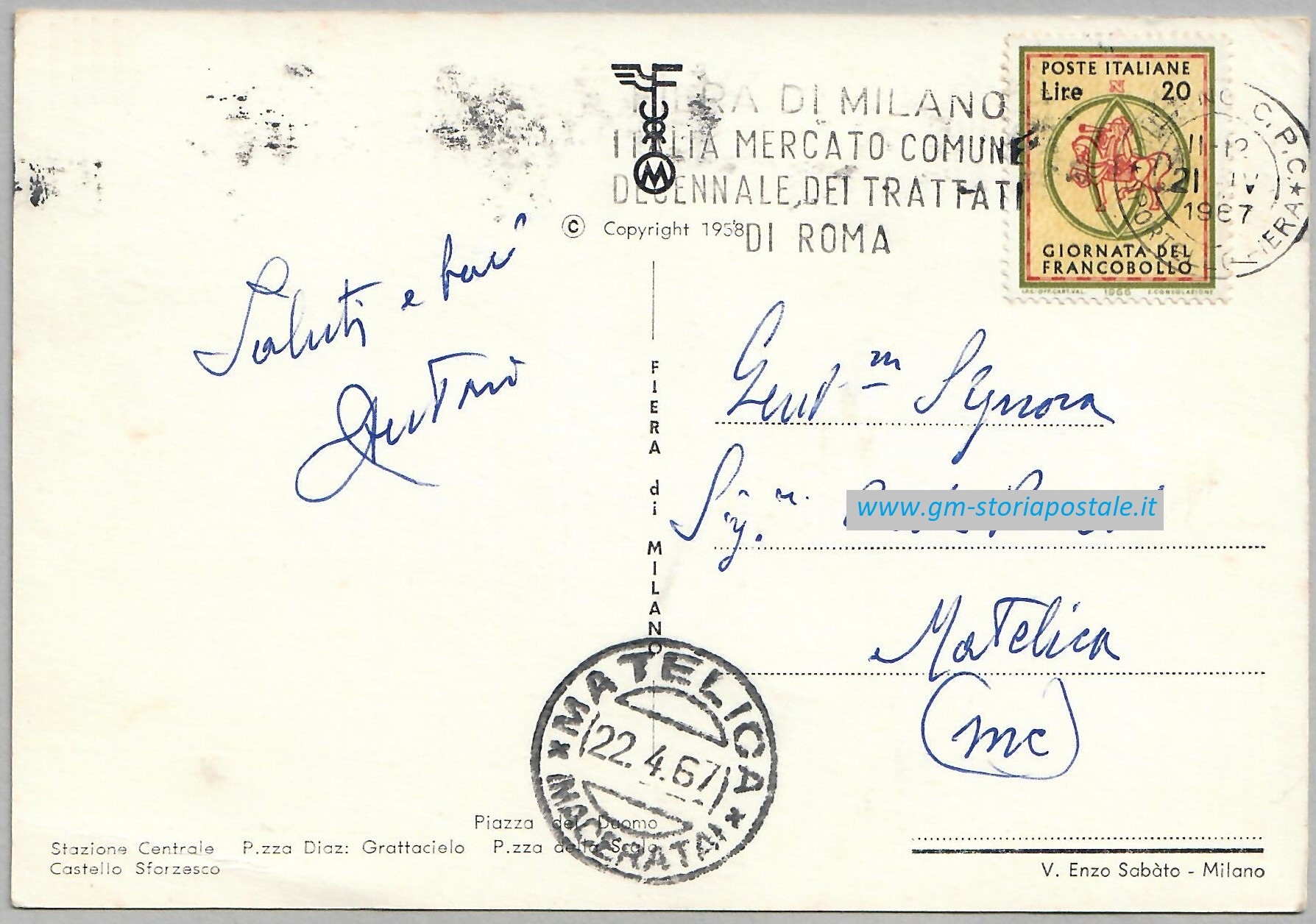 Tra il 1° agosto 1965 ed il 15 agosto 1967 una cartolina illustrata con testo non superiore a 5 parole di convenevoli si affrancava con 20 lire. L’esemplare sotto riportato fu spedito da Milano (annullo con targhetta) il 21 aprile 1967 per Matelica, dove giunse il giorno successivo.