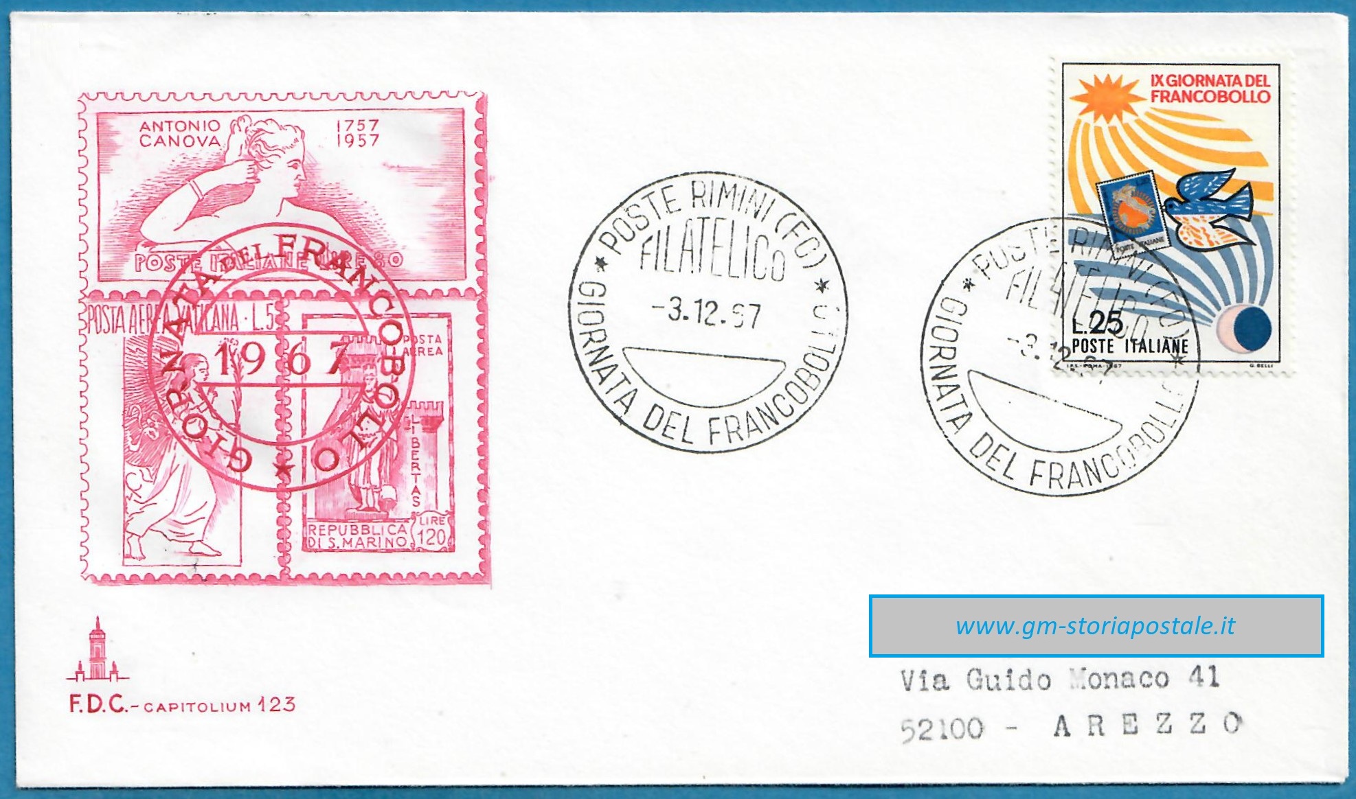 Il francobollo commemorativo da 25 lire dedicato alla Giornata del Francobollo del 1967 fu emesso il 3 dicembre 1967 con validità permanente. In occasione dell’emissione fu in uso in tutti i capoluoghi di provincia il consueto bollo speciale in uso anche negli anni precedenti e successivi.