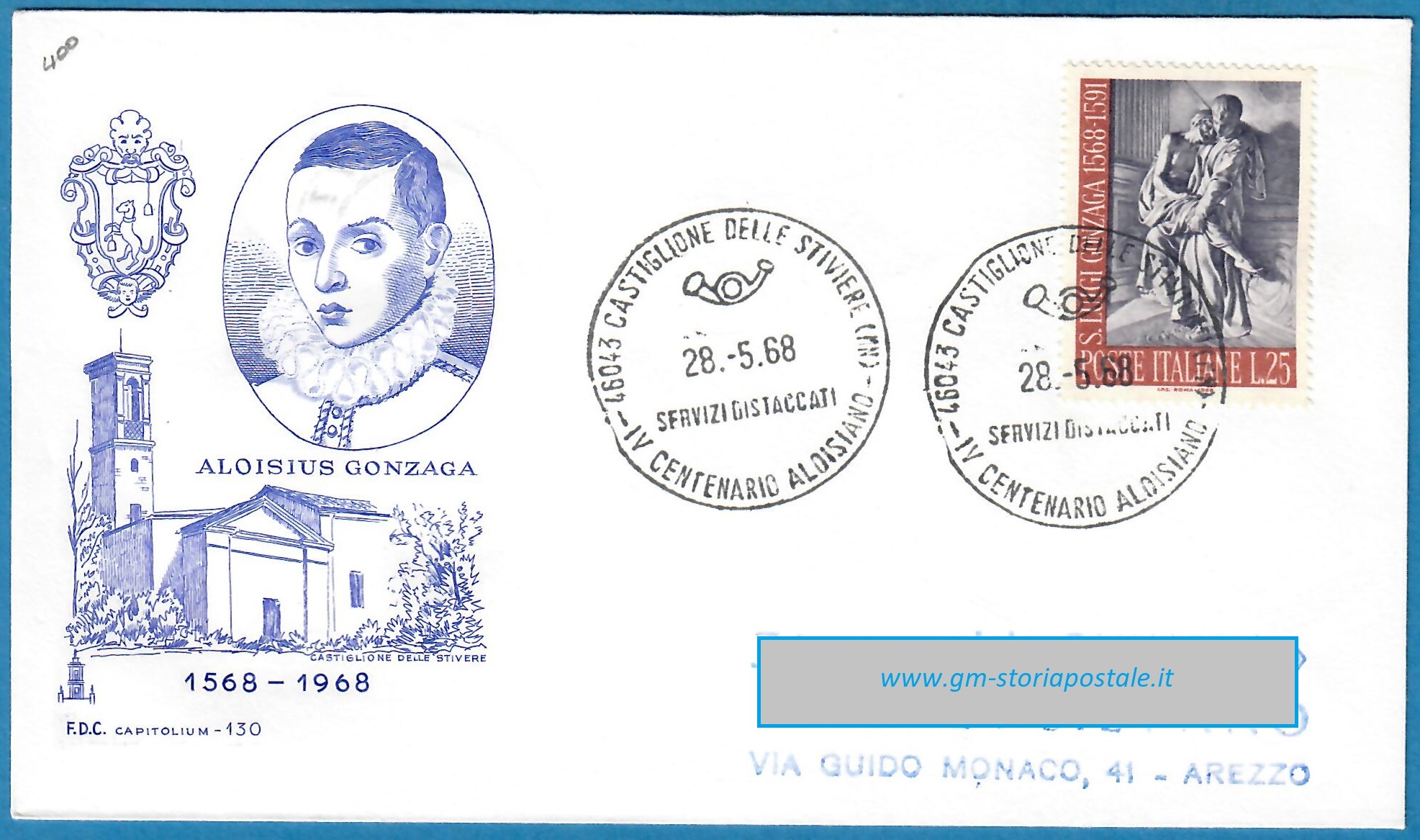 Il francobollo commemorativo da 25 lire dedicato al 4° centenario della nascita di San Luigi Gonzaga fu emesso il 28 maggio 1968 con validità permanente. In occasione dell’emissione fu in uso a Castiglione dello Stiviere, luogo di nascita del religioso proclamato Santo, un bollo speciale.