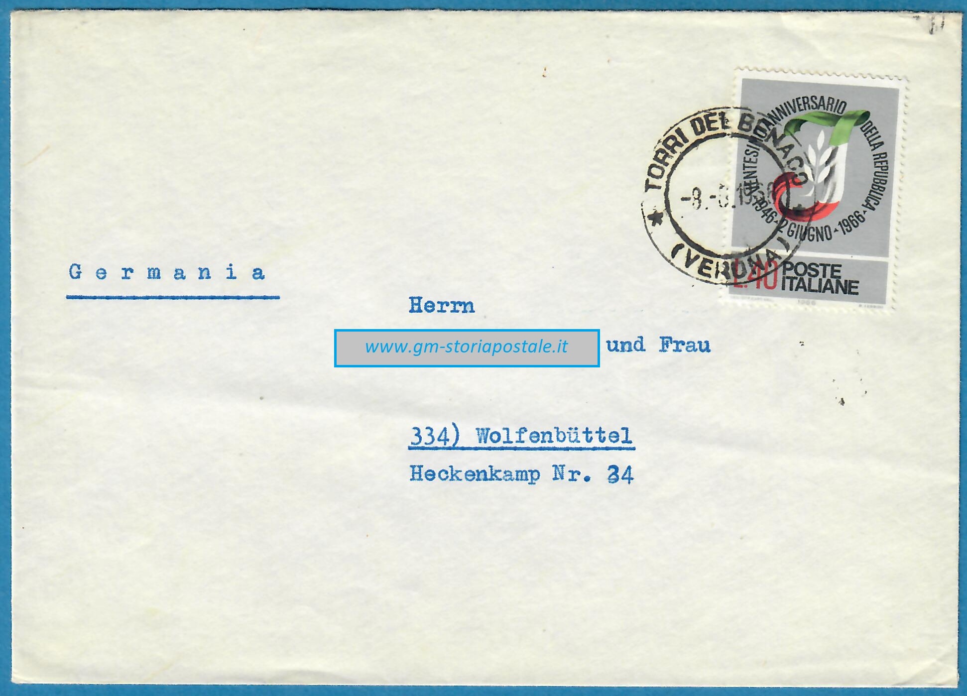A partire dal 1° agosto 1965 le lettere primo pronto dirette in Germania godevano dell’agevolazione tariffaria che permetteva di inviare alla stessa tariffa della lettera per l’interno: tra il 1° agosto 1965 ed il 15 agosto 1967 la lettera per la Germania si affrancava con 40 lire. L’esemplare sotto riportato fu spedito da Torri del Benaco l’8 agosto 1966.