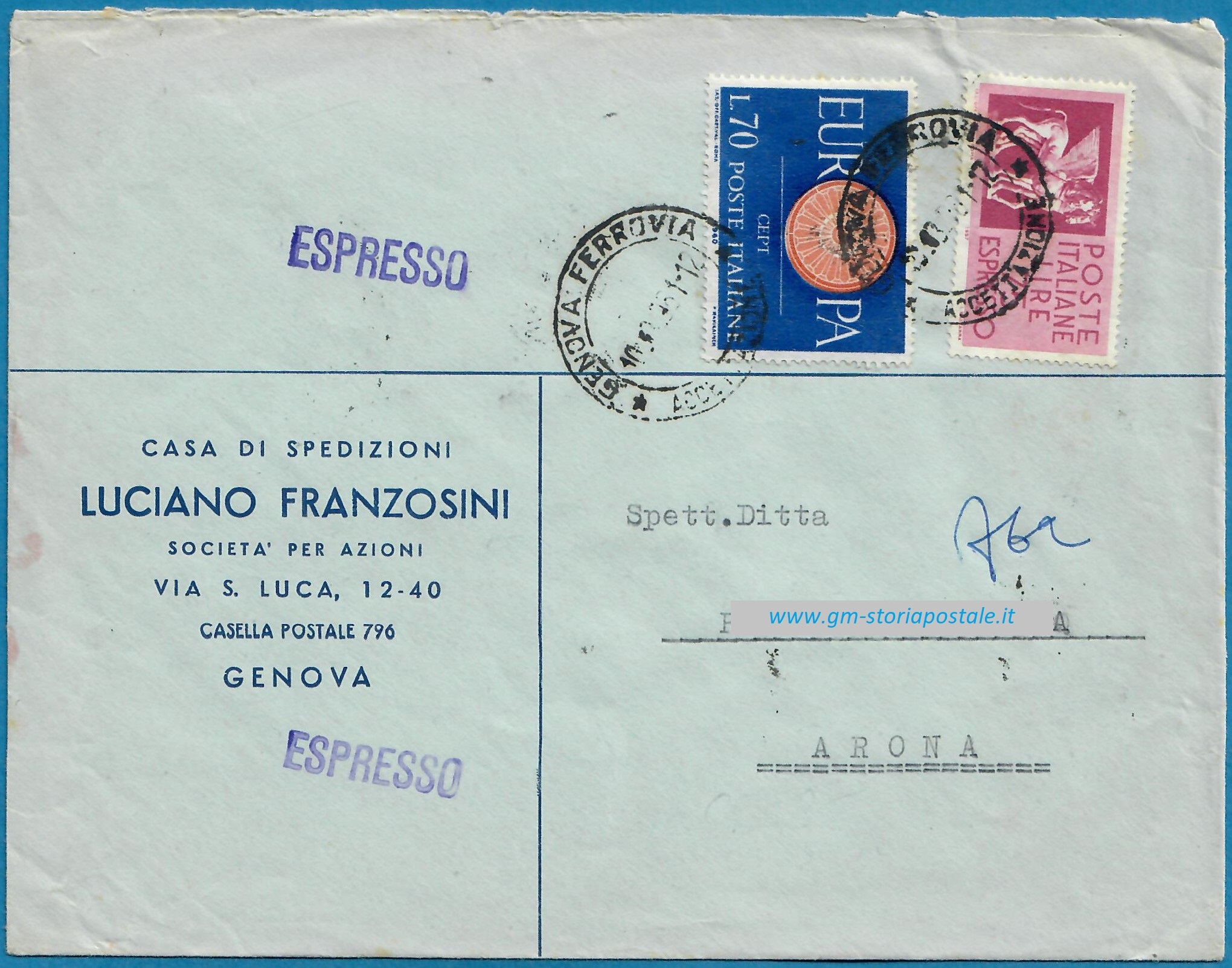 Tra il 1° ottobre 1957 ed il 31 luglio 1965 la soprattassa per il recapito espresso era di 75 lire: vi fu quindi un periodo in cui la lettera terzo porto espresso si affrancava con 145 lire. L’esemplare sotto riportato fu spedito da Genova il 10 marzo 1961 per Arona, dove giunse il giorno successivo.