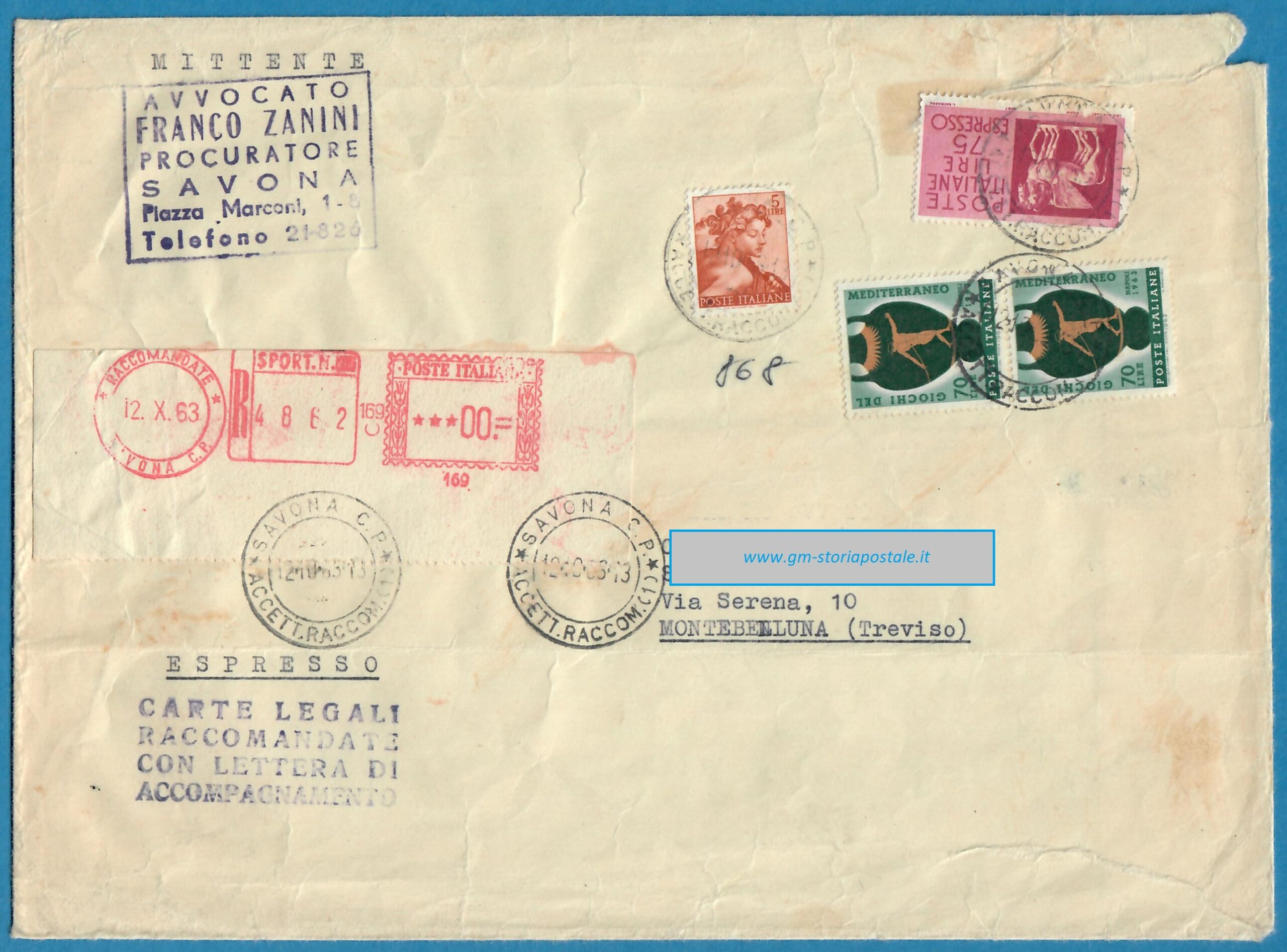 Si riportano dei manoscritti raccomandati espressi con lettera di accompagnamento, spediti da Savona il 12 ottobre 1963 per Montebelluna. La genesi della tariffa è la seguente: