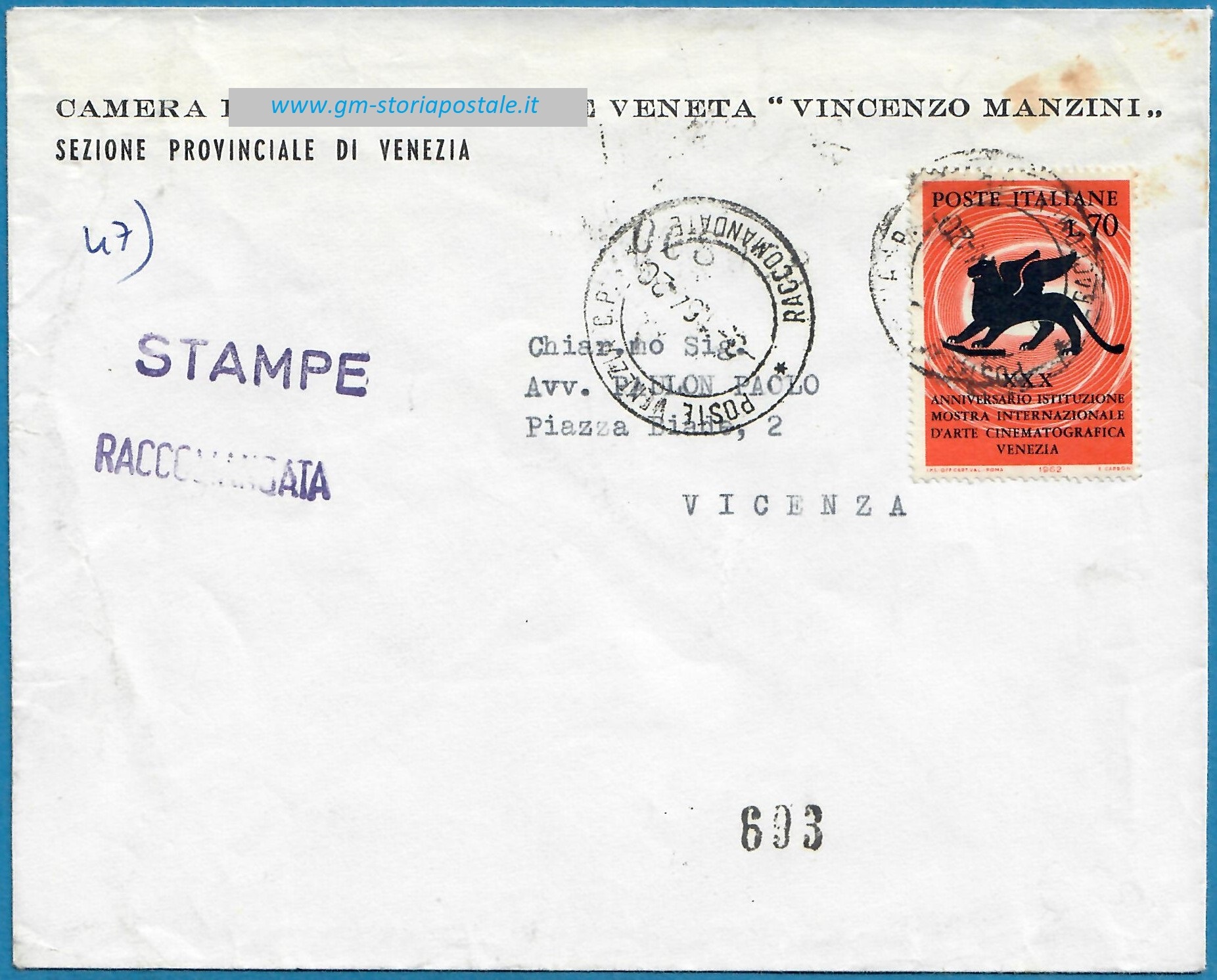 Tra il 1° ottobre 1957 ed il 31 luglio 1965 la tariffa per affrancare le stampe era di 10 lire, mentre nello stesso periodo la soprattassa per la raccomandazione di corrispondenze aperte ammontava a 60 lire (50 lire + 10 lire di diritto di ricevuta fino al 31 agosto 1959, poi 60 lire): le stampe raccomandate si affrancavano quindi con 70 lire. L’esemplare sotto riportato fu spedito da Venezia il 3 gennaio 1964 per Vicenza, dove giunse il giorno successivo. Il francobollo, valido fino al 31 dicembre 1963, fu usato pochi giorni dopo la scadenza della validità, ma fu tollerato.