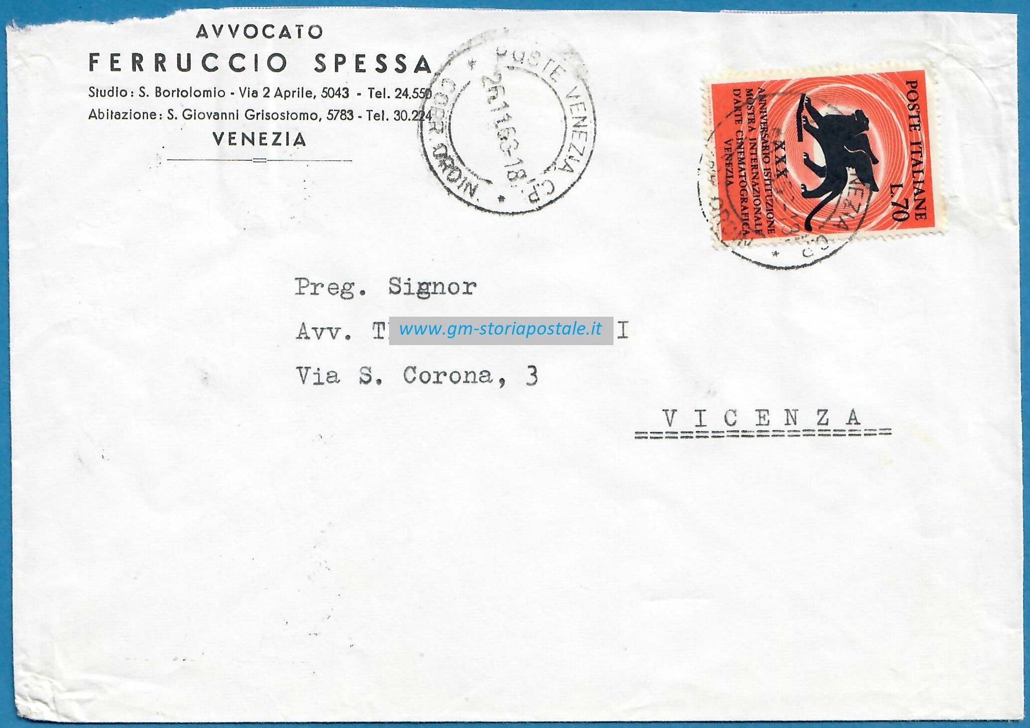 Tra il 1° luglio 1960 ed il 31 ottobre 1965 la lettera primo porto si affrancava con 30 lire mentre i porti successivi si affrancavano con 20 lire supplementari ogni 20 grammi successivi. La lettera terzo porto, pertanto, si affrancava con 30 + 20 + 20 = 70 lire. L’esemplare sotto riportato fu spedito da Venezia il 26 novembre 1963 per Vicenza, dove giunse il giorno successivo.
