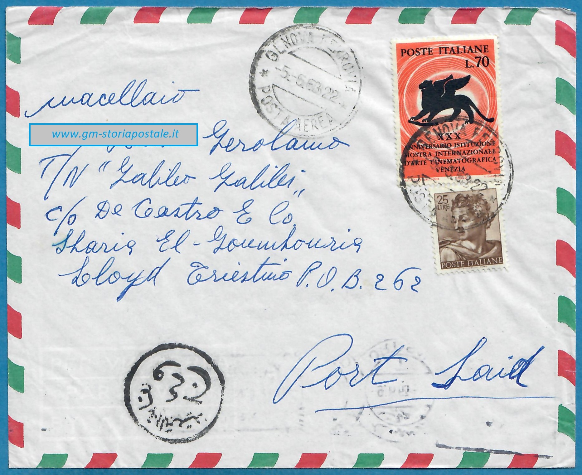 Tra il 1° gennaio 1954 ed il 24 marzo 1975 la soprattassa di posta aerea per le lettere verso l’Egitto ammontava a 25 lire: vi fu quindi un periodo in cui la lettera via aerea per l’Egitto si affrancava per 95 lire. L’esemplare sotto riportato fu spedito da Genova il 5 giugno 1963, transitò il 7 giugno al Cairo e giunse a Porto Said il 9 giugno successivo.