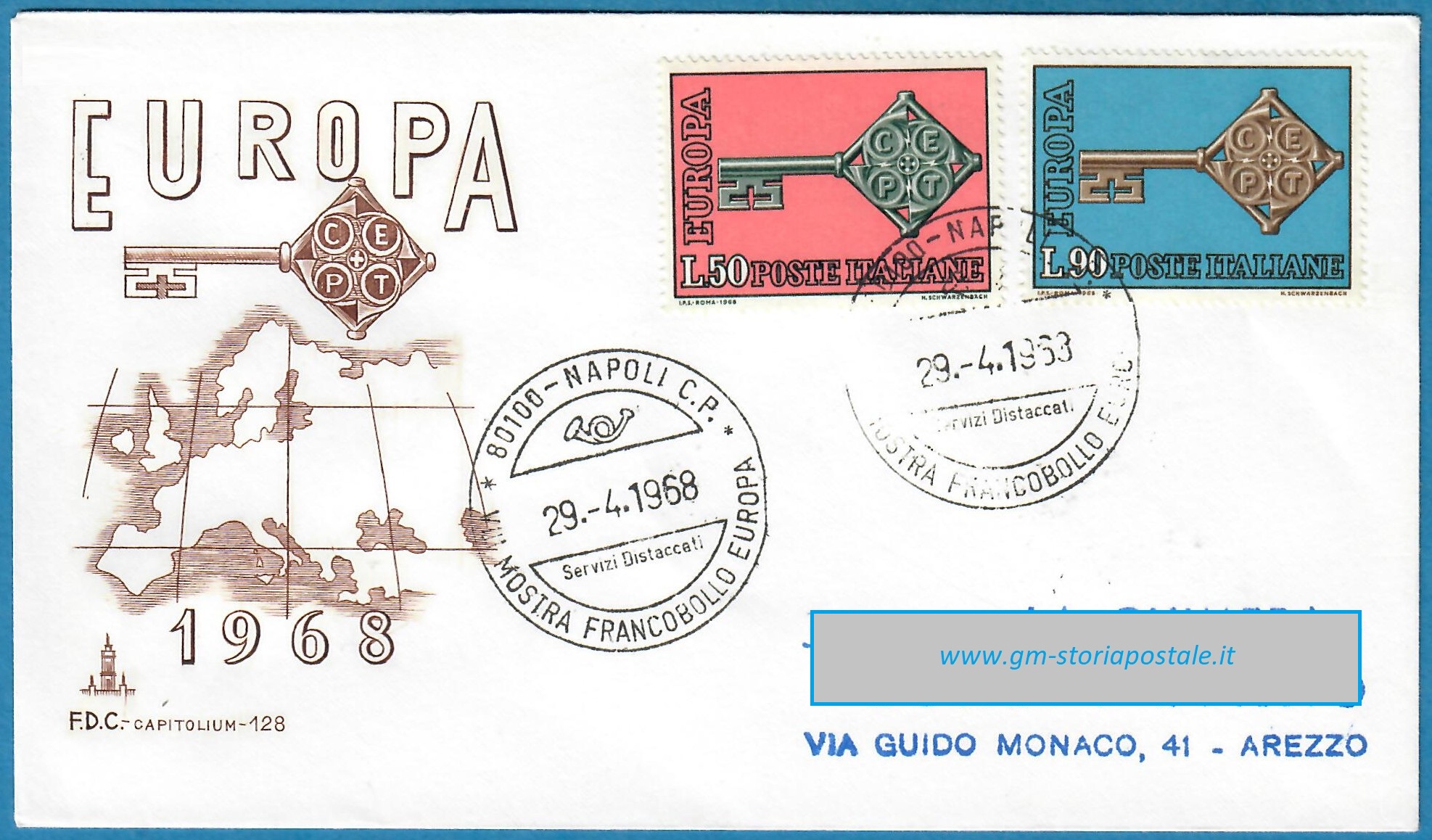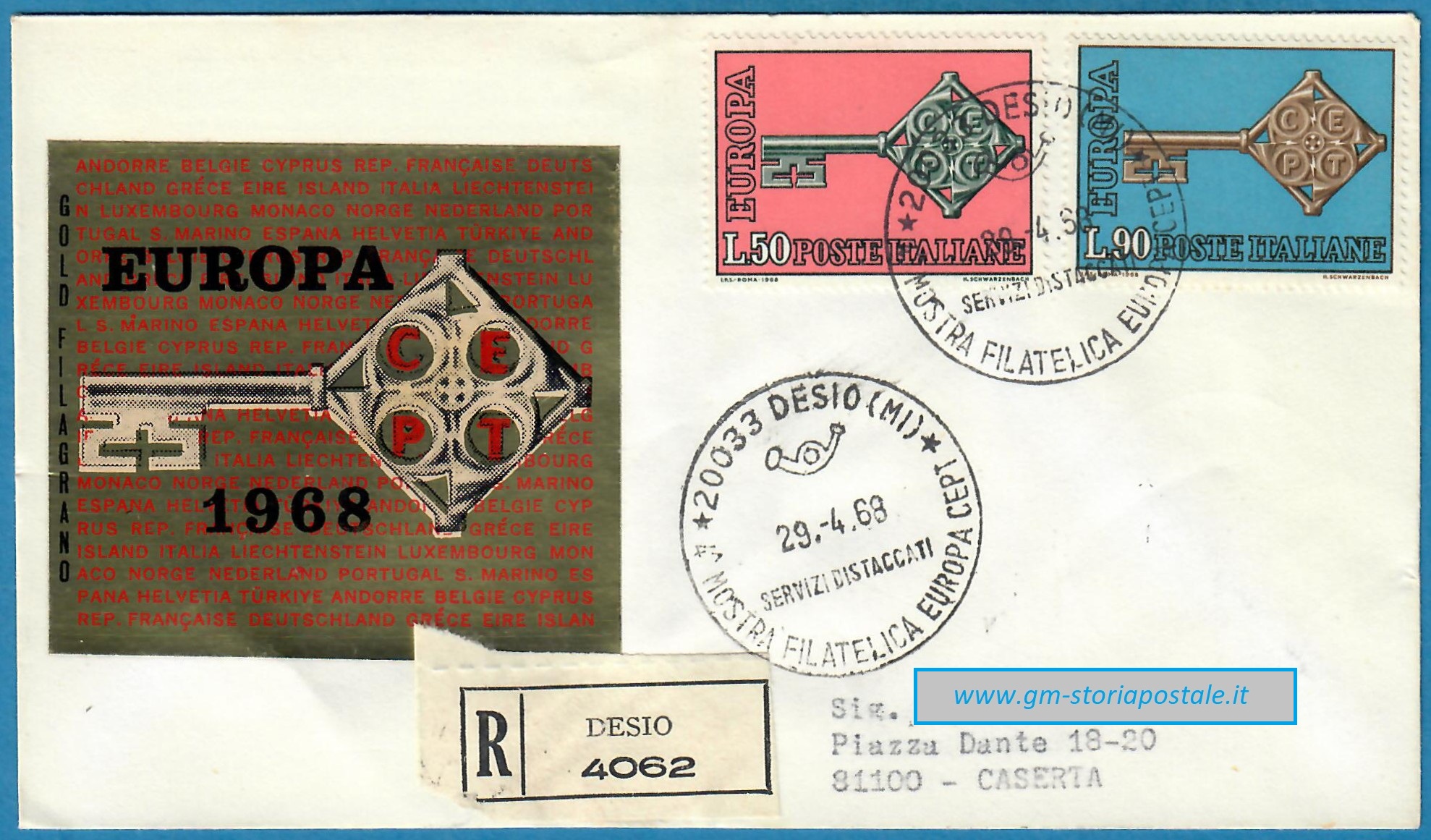 Il francobollo commemorativo da 90 lire della serie del 1968 dedicata all’Europa fu emesso il 29 aprile 1968 con validità permanente. In occasione dell’emissione furono in uso in più città dei bolli speciali.
