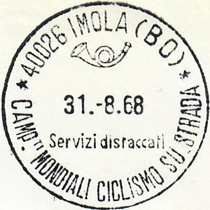 Il francobollo commemorativo da 90 lire della serie dedicata al campionati mondiali di ciclismo su strada fu emesso il 26 agosto 1968 con validità permanente. In occasione del primo giorno di emissione fu in uso a Roma un bollo speciale.