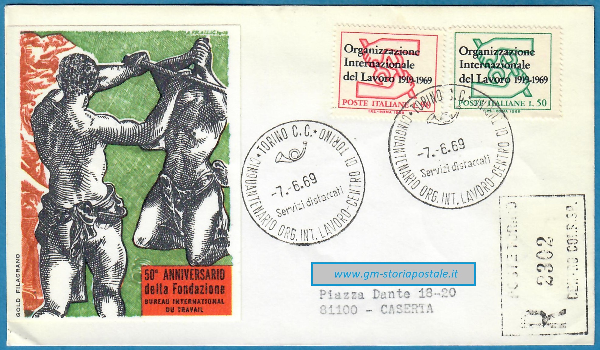 Il francobollo commemorativo da 90 lire della serie dedicata al cinquantenario dell’Organizzazione Internazionale del Lavoro fu emesso il 7 giugno 1969 con validità permanente. In occasione dell’emissione fu in uso a Torino un bollo speciale.