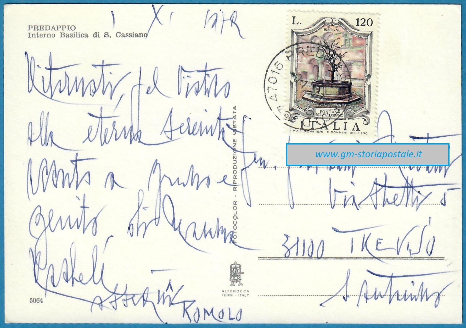 Tra il 1° novembre 1976 ed il 31 dicembre 1980 la tariffa per affrancare una cartolina era di 120 lire. L’esemplare sotto riportato fu spedito da Predappio il 3 novembre 1979 per Treviso.