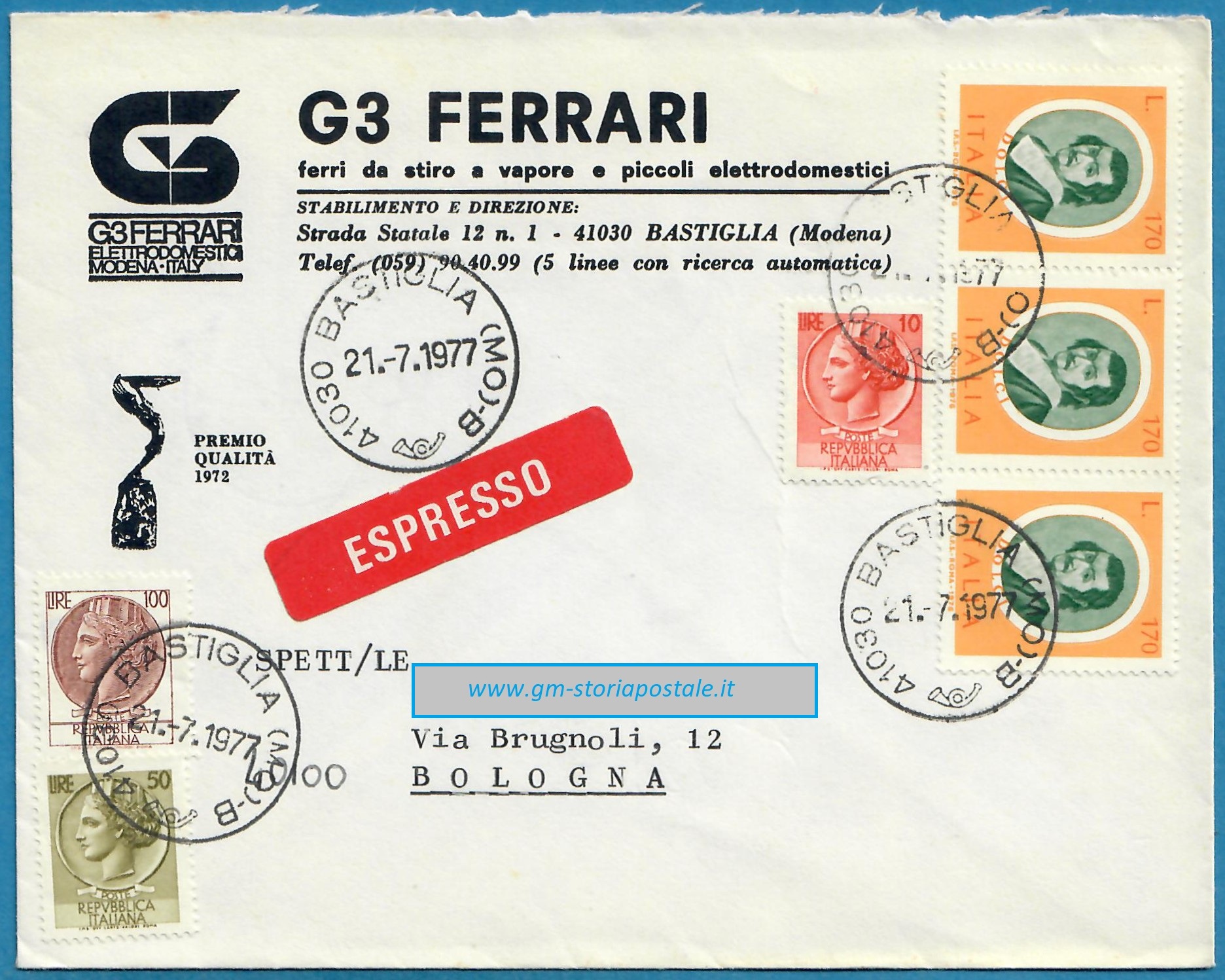 Nello stesso periodo la lettera tra 20 e 50 grammi si affrancava con 320 lire mentre la soprattassa per il recapito espresso ammontava a 350 lire. La lettera tra 20 e 50 grammi da recapitarsi per espresso si affrancava con 670 lire. L’esemplare sotto riportato fu spedito da Bastiglia il 21 luglio 1977 per Bologna.