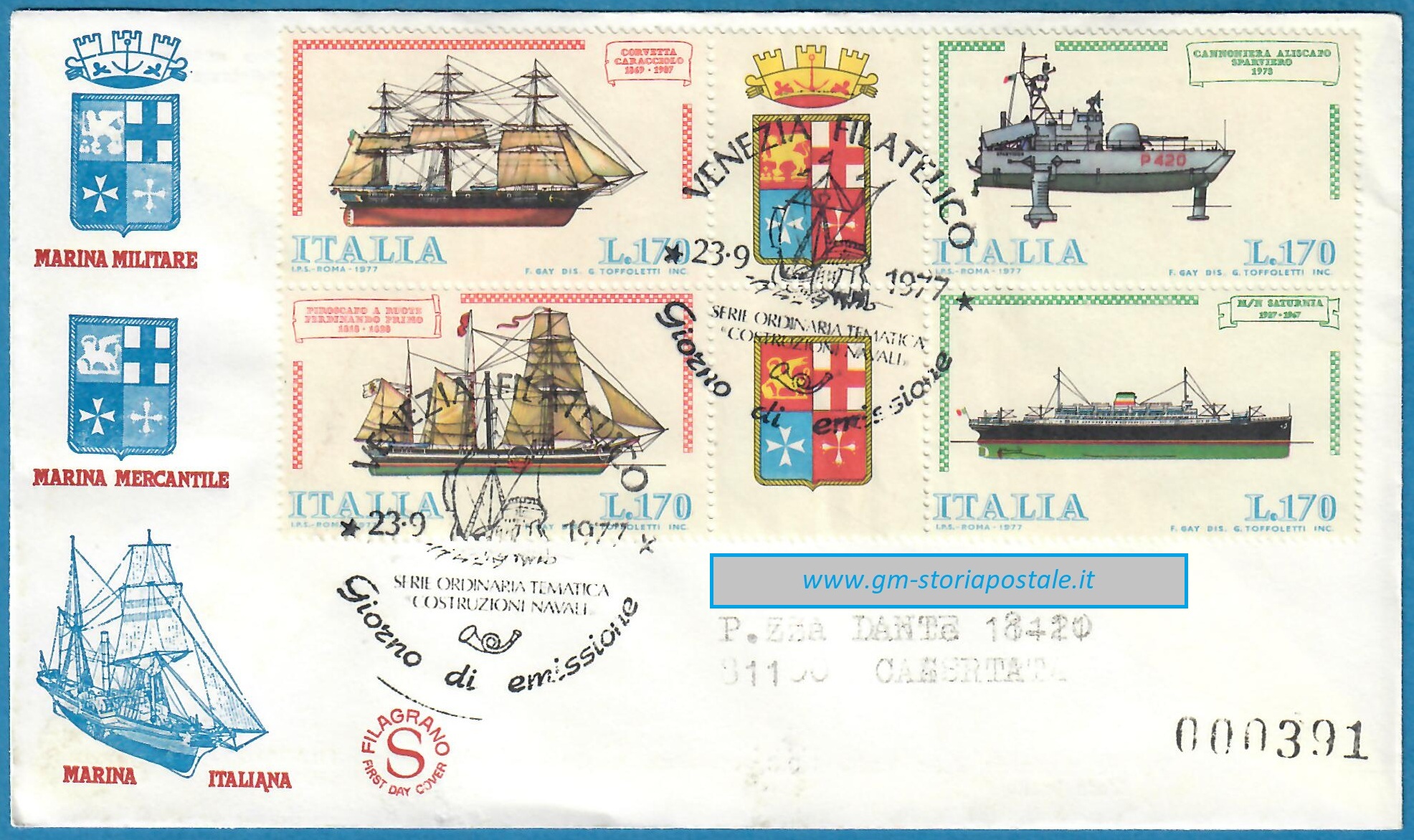 Il blocco di quattro francobolli commemorativi da 170 lire della serie del 1977 dedicata alle costruzioni navali italiane, fu emesso il 23 settembre 1977 con validità permanente. I quattro francobolli rappresentano il piroscafo Ferdinando Primo, la corvetta Caracciolo, la motonave Saturnia e la cannoniera Sparviero. Il bollo speciale per il primo giorno di emissione fu in uso ad Ancona, Cagliari, Genova, La Spezia, Livorno, Napoli, Palermo, Taranto, Trieste e Venezia.