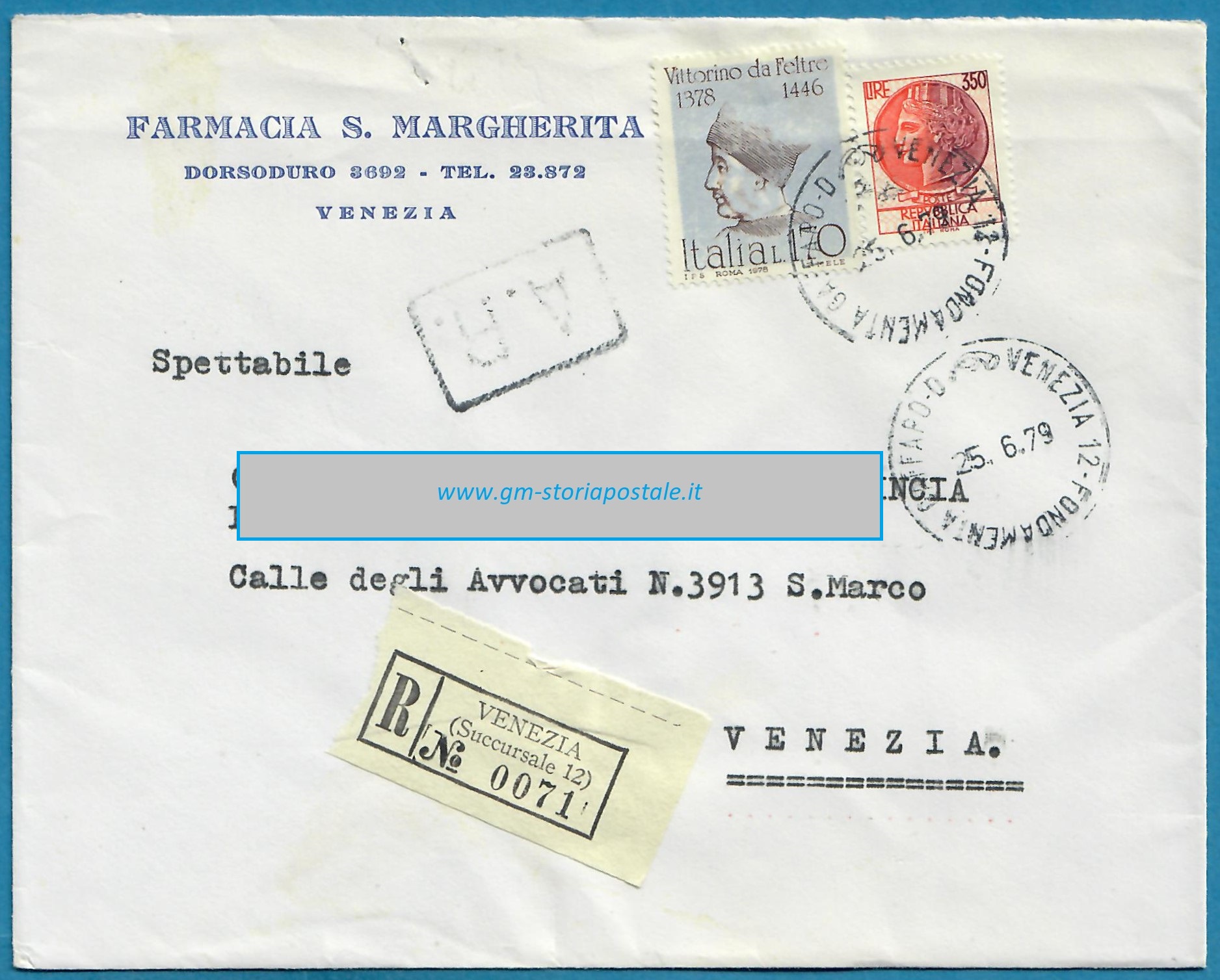 Tra il 1° novembre 1976 ed il 31 dicembre 1980 la soprattassa la raccomandazione ammontava a 350 lire. Una lettera primo porto raccomandata si affrancava quindi con 520 lire. L’esemplare sotto riportato fu spedito da Venezia il 25 giugno 1979 per la città.