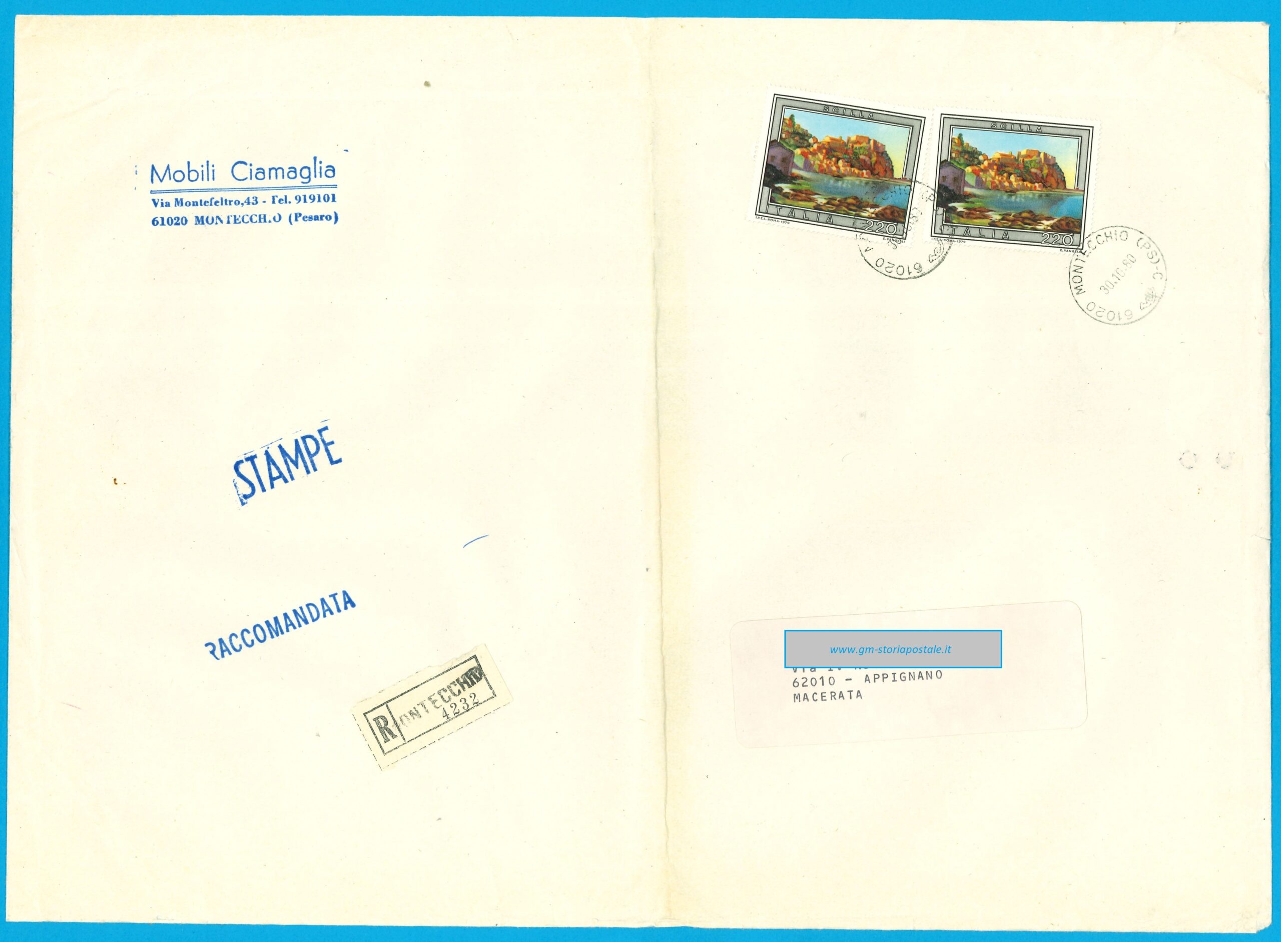 Tra il 1° novembre 1976 ed il 31 dicembre 1980 la tariffa per affrancare le stampe tra 50 e 100 grammi era di 90 lire mentre nello stesso periodo la sovrattassa per la raccomandazione ammontava a 350 lire: le stampe tra 50 e 100 grammi raccomandate si affrancavano quindi con 440 lire. L’esemplare sotto riportato fu spedito da Montecchio il 30 ottobre 1980 per Appignano, dove giunse il 3 novembre successivo.