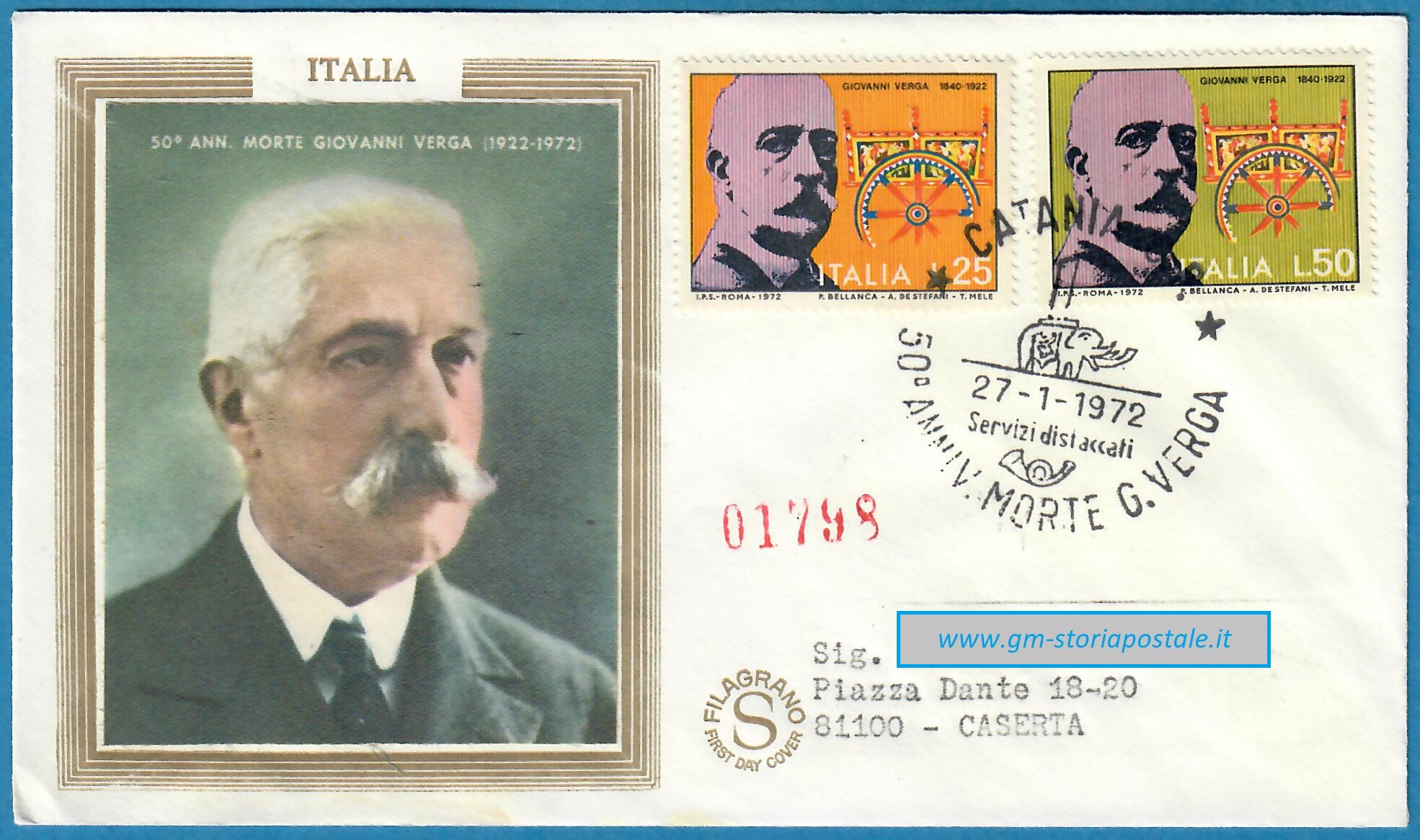 Il francobollo commemorativo da 25 lire della serie dedicata al cinquantenario della morte di Giovanni Verga fu emesso il 27 gennaio 1972 con validità permanente. In occasione dell’emissione fu in uso a Catania un bollo speciale.