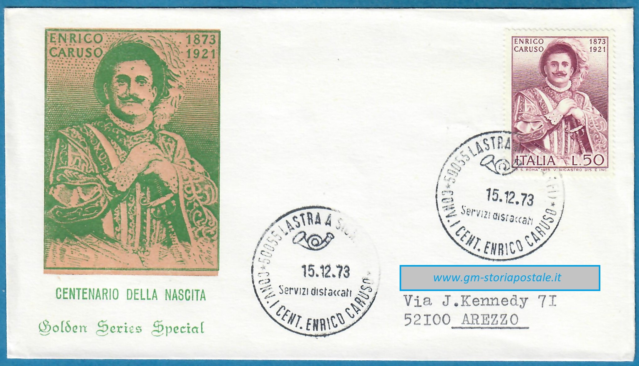 Il francobollo commemorativo da 50 lire dedicato al centenario della nascita di Enrico Caruso fu emesso il 15 dicembre 1973 con validità permanente. In occasione dell’emissione fu in uso a Lastra a Signa un bollo speciale.