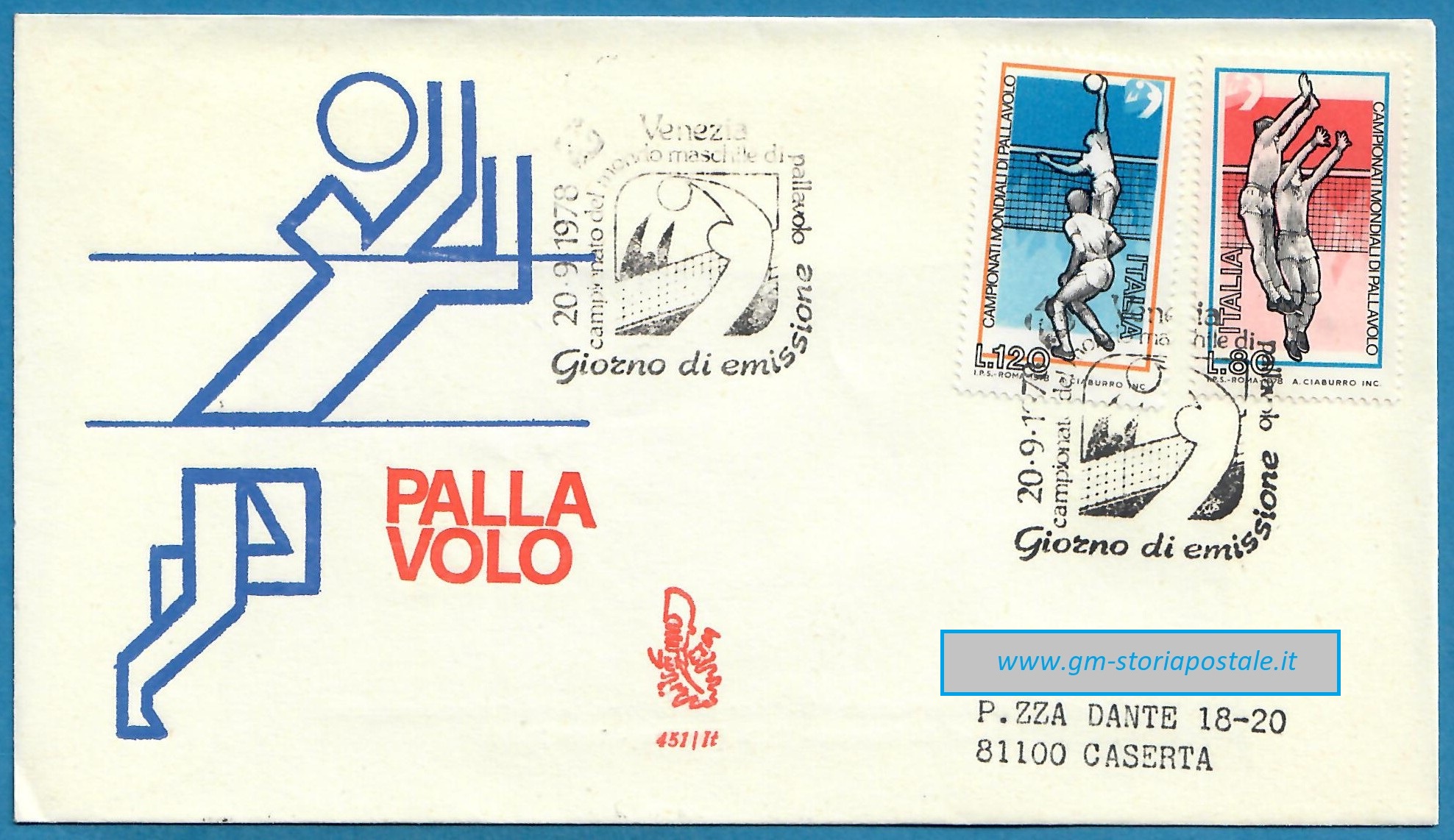 Il francobollo commemorativo da 80 lire della serie dedicata ai campionati mondiali maschili di pallavolo fu emesso il 20 settembre 1978 con validità permanente. L’annullo speciale per il primo giorno di emissione fu in uso a Roma, Ancona, Bergamo, Parma, Udine e Venezia.