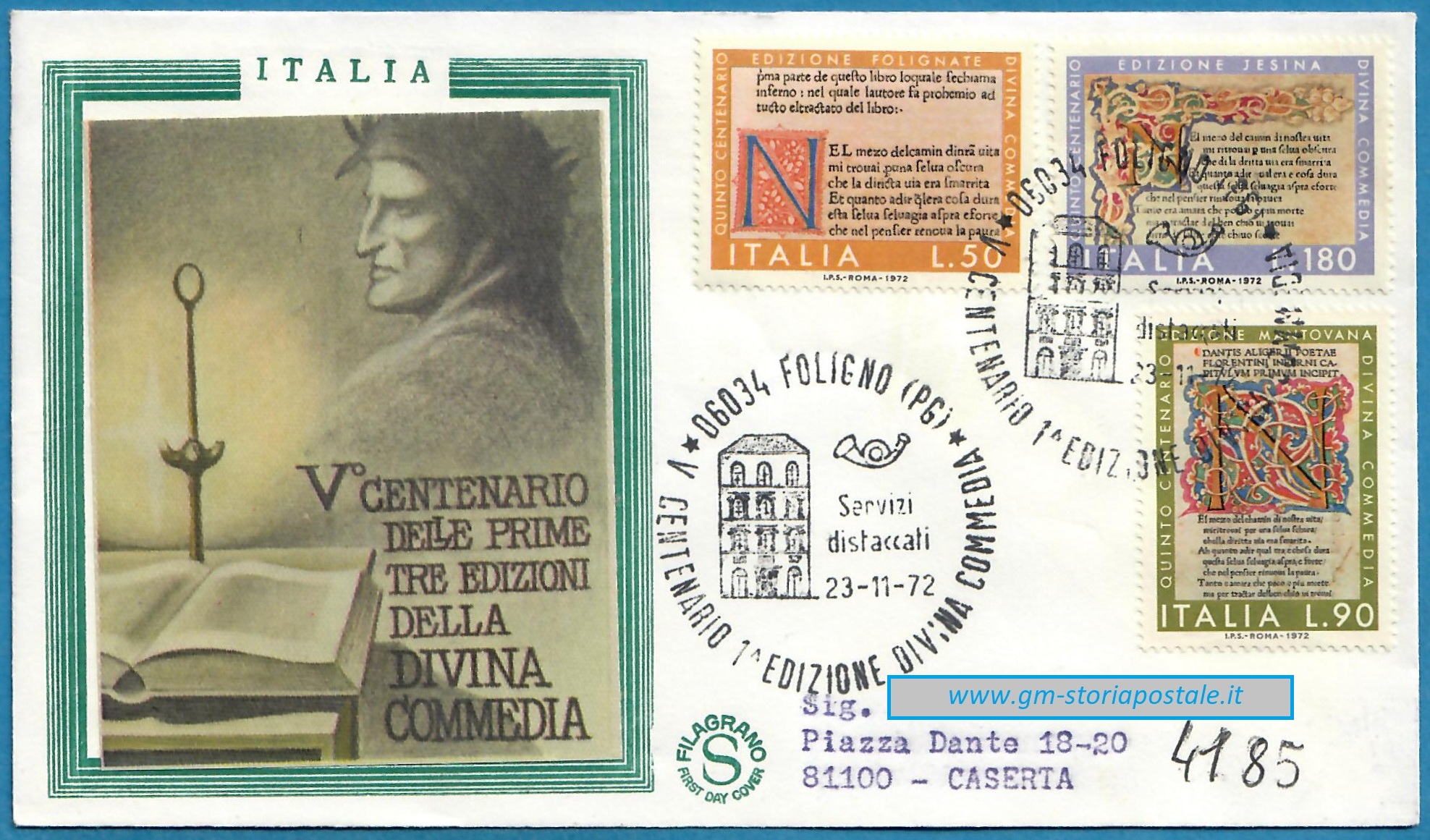 Il francobollo commemorativo da 90 lire della serie dedicata al 5° centenario delle prime tre edizioni della Divina Commedia fu emesso il 23 novembre 1972 con validità permanente. In occasione dell’emissione fu in uso a Foligno un bollo speciale.