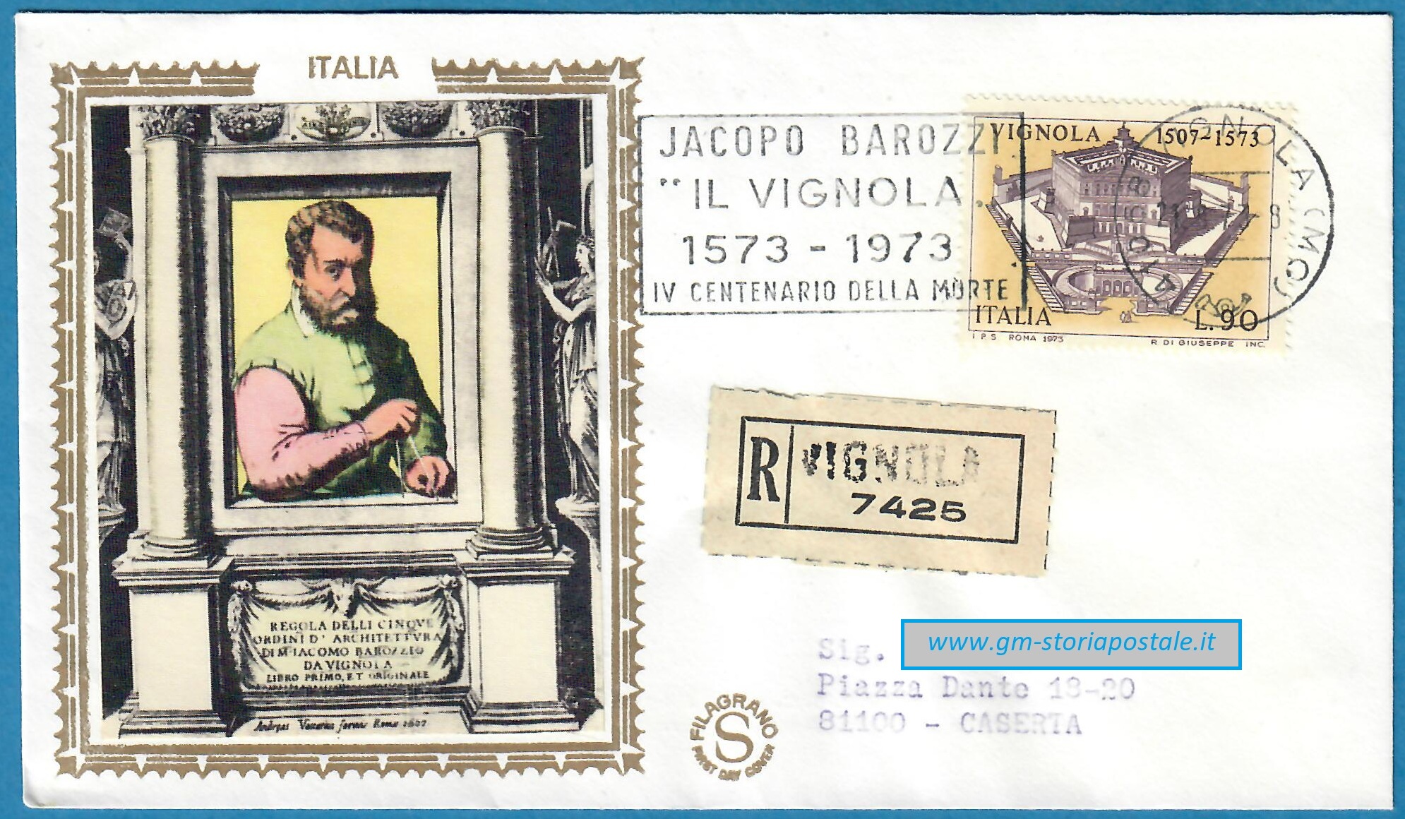 Il francobollo commemorativo da 90 lire dedicato Jacopo Barozzi detto “Il Vignola” fu emesso il 21 settembre 1973 con validità permanente. Contrariamente all’uso consueto del bollo speciale in occasione del primo giorno di emissione, a Vignola fu in uso una targhetta.