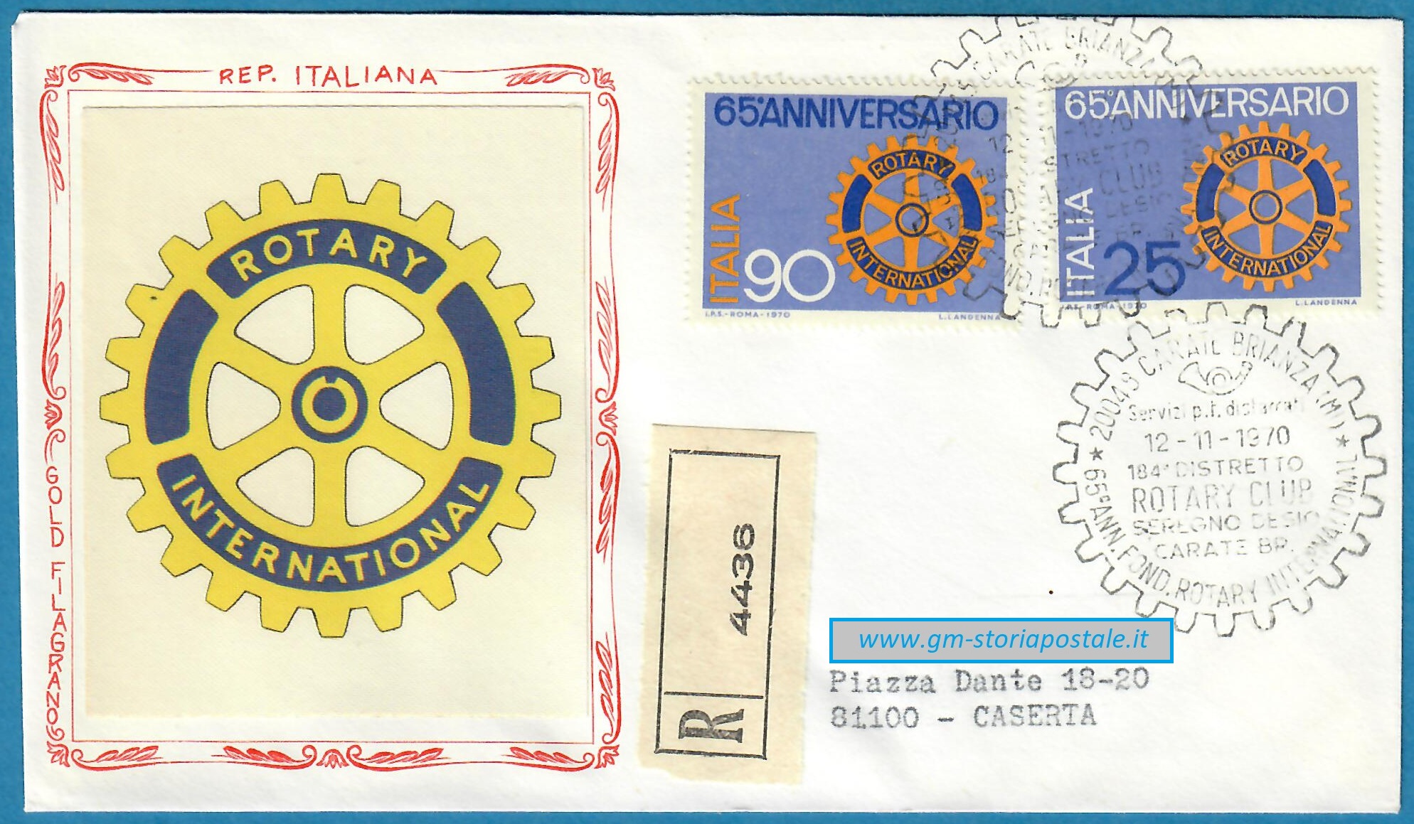 Il francobollo commemorativo da 90 lire della serie dedicata al 65° anniversario del Rotary Club fu emesso il 12 novembre 1970 con validità permanente. In occasione dell’anniversario ebbe luogo a Roma una riunione del Rotary Club, sezioni ENAEM (Europe North Africa Eastern Mediterranean) e presso la sede della riunione fu in uso un bollo speciale, in uso anche nel giorno di emissione e che si trova quindi nelle buste primo giorno approntate a Roma.