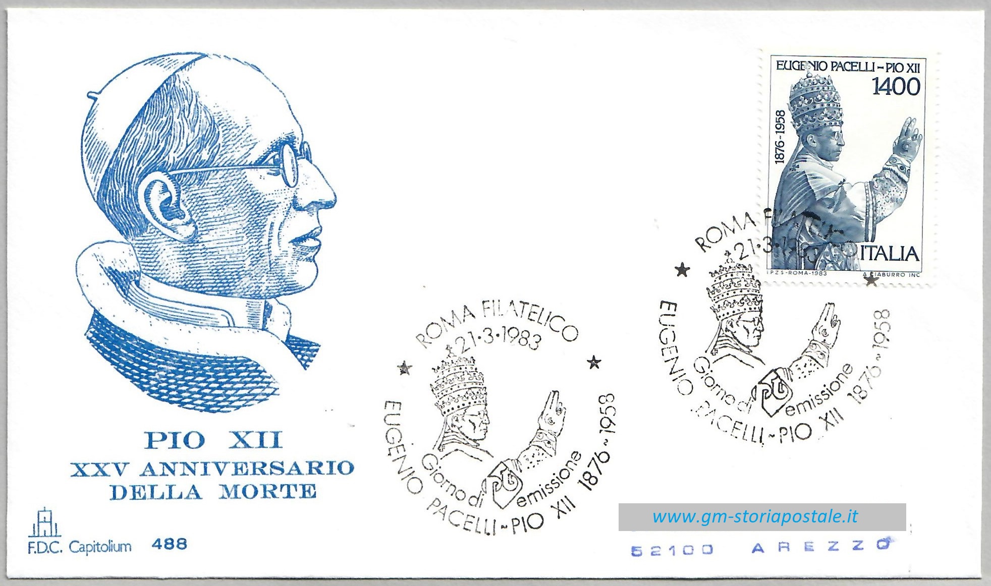 Il francobollo commemorativo da 1400 lire dedicato a Pio XII fu emesso il 21 marzo 1983 con validità permanente. L’annullo speciale per il primo giorno di emissione fu in uso a Roma.