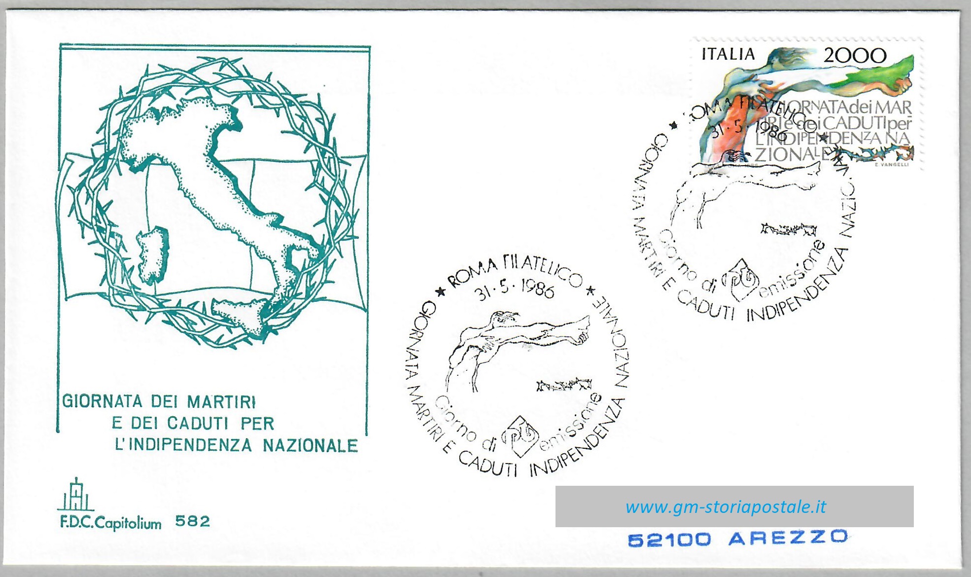 Il francobollo commemorativo da 2000 lire dedicato alla Giornata dei Martiri e dei Caduti per l’Indipendenza nazionale fu emesso il 31 maggio 1986 con validità permanente. L’annullo speciale per il primo giorno di emissione fu in uso a Roma.