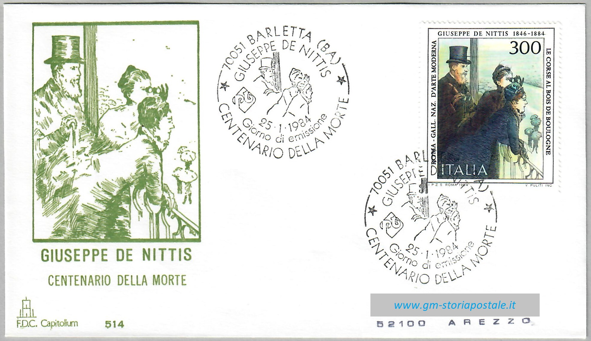 Il francobollo commemorativo da 300 lire della serie “Arte Italiana” del 1984, dedicato a Giuseppe De Nittis, fu emesso il 25 gennaio 1984 con validità permanente. L’annullo speciale per il primo giorno di emissione fu in uso a Barletta.