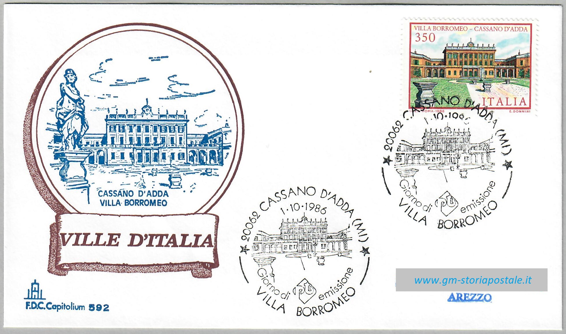 Il francobollo commemorativo da 350 lire della serie del 1986 dedicata alle ville d’Italia, raffigurante Villa Borromeo a Cassano d’Adda, fu emesso il 1° ottobre 1986 con validità permanente. L’annullo speciale per il primo giorno di emissione fu in uso a Cassano d’Adda.