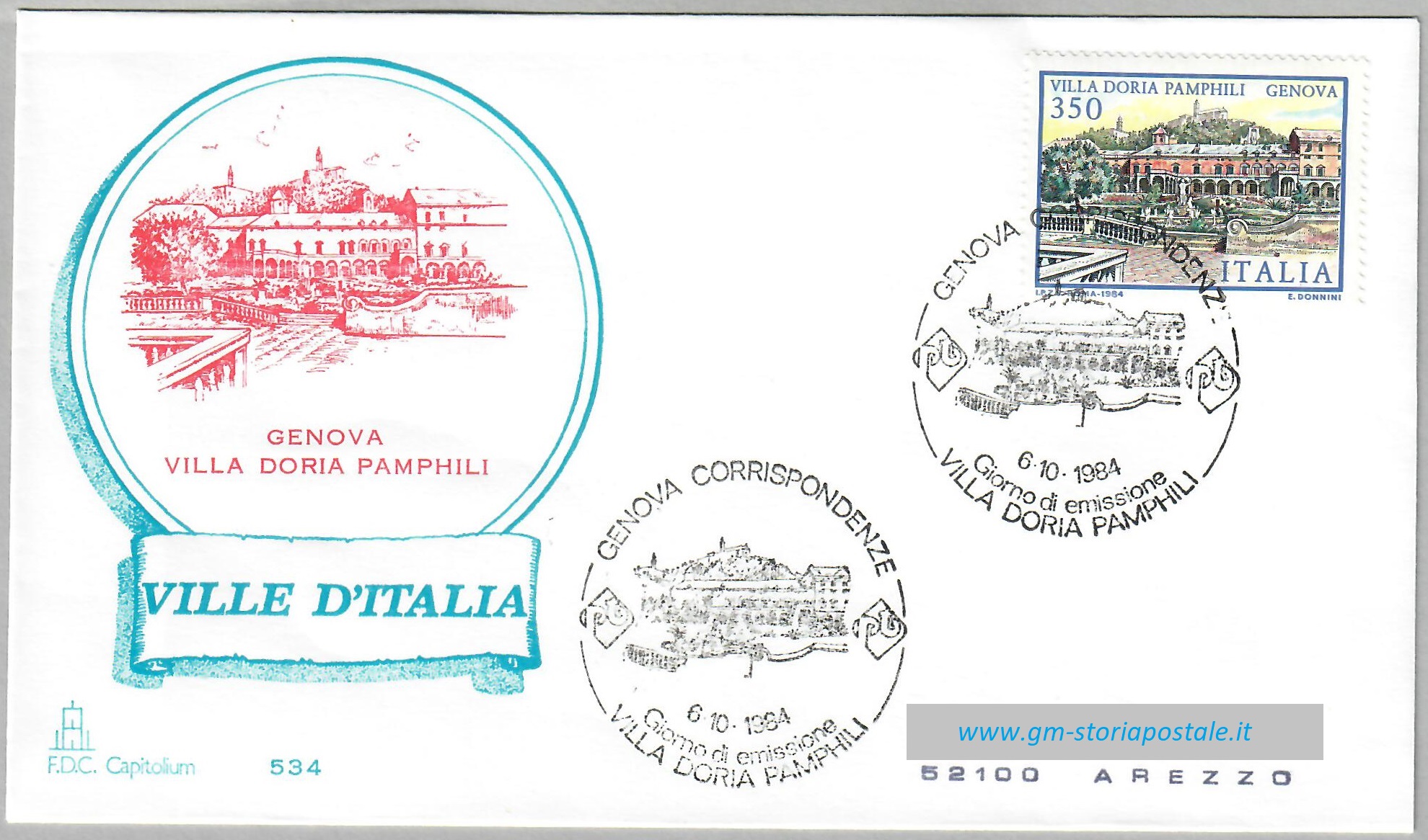 Il francobollo commemorativo da 350 lire della serie del 1984 dedicata alle ville d’Italia, raffigurante Villa Doria Pamphili a Genova, fu emesso il 6 ottobre 1984 con validità permanente. L’annullo speciale per il primo giorno di emissione fu in uso a Genova.
