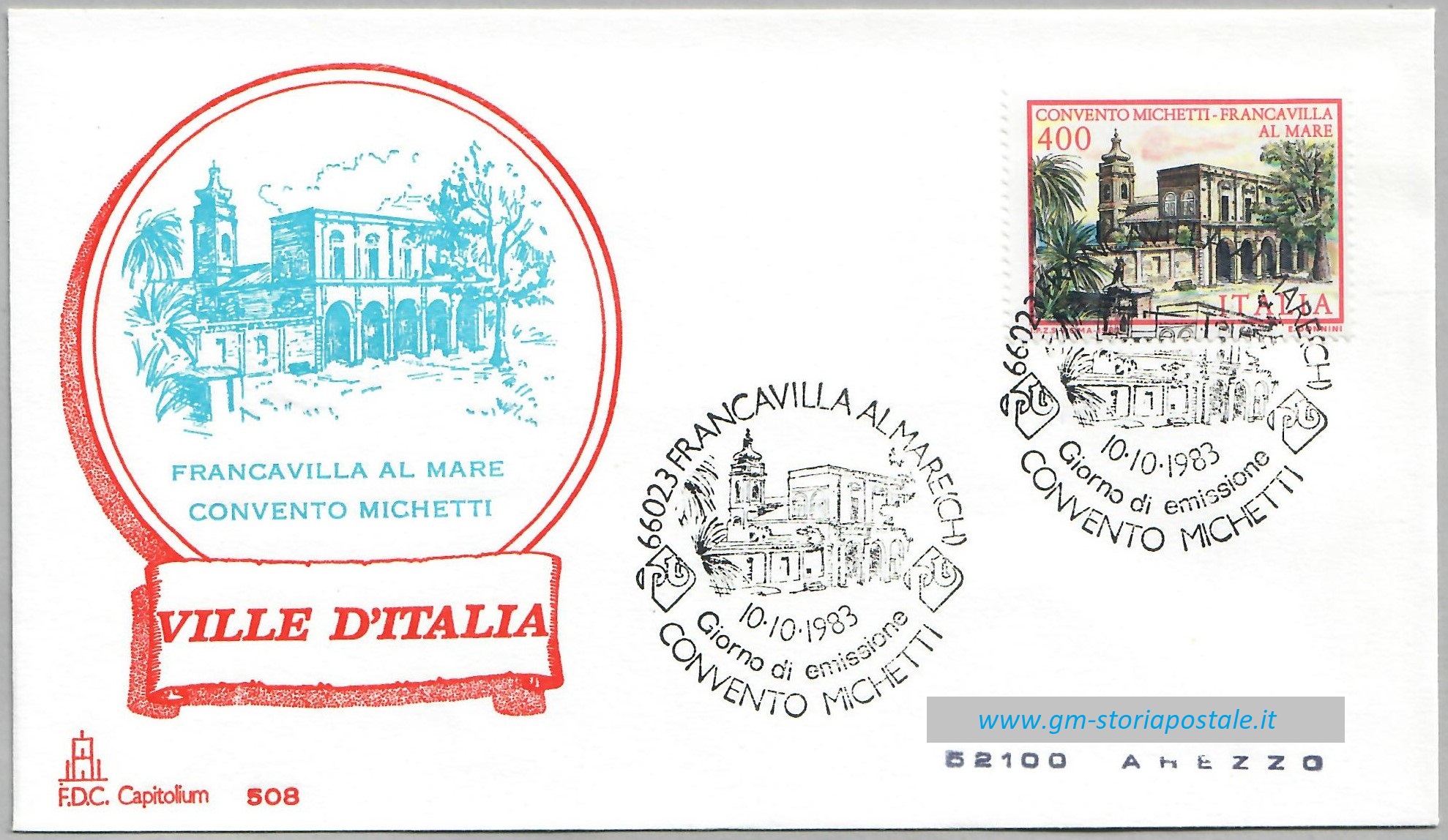 Il francobollo commemorativo da 400 lire della serie del 1982 dedicata alle ville d’Italia, raffigurante il Convento Michetti a Francavilla al Mare, fu emesso il 10 ottobre 1983 con validità permanente. L’annullo speciale per il primo giorno di emissione fu in uso a Francavilla al Mare.