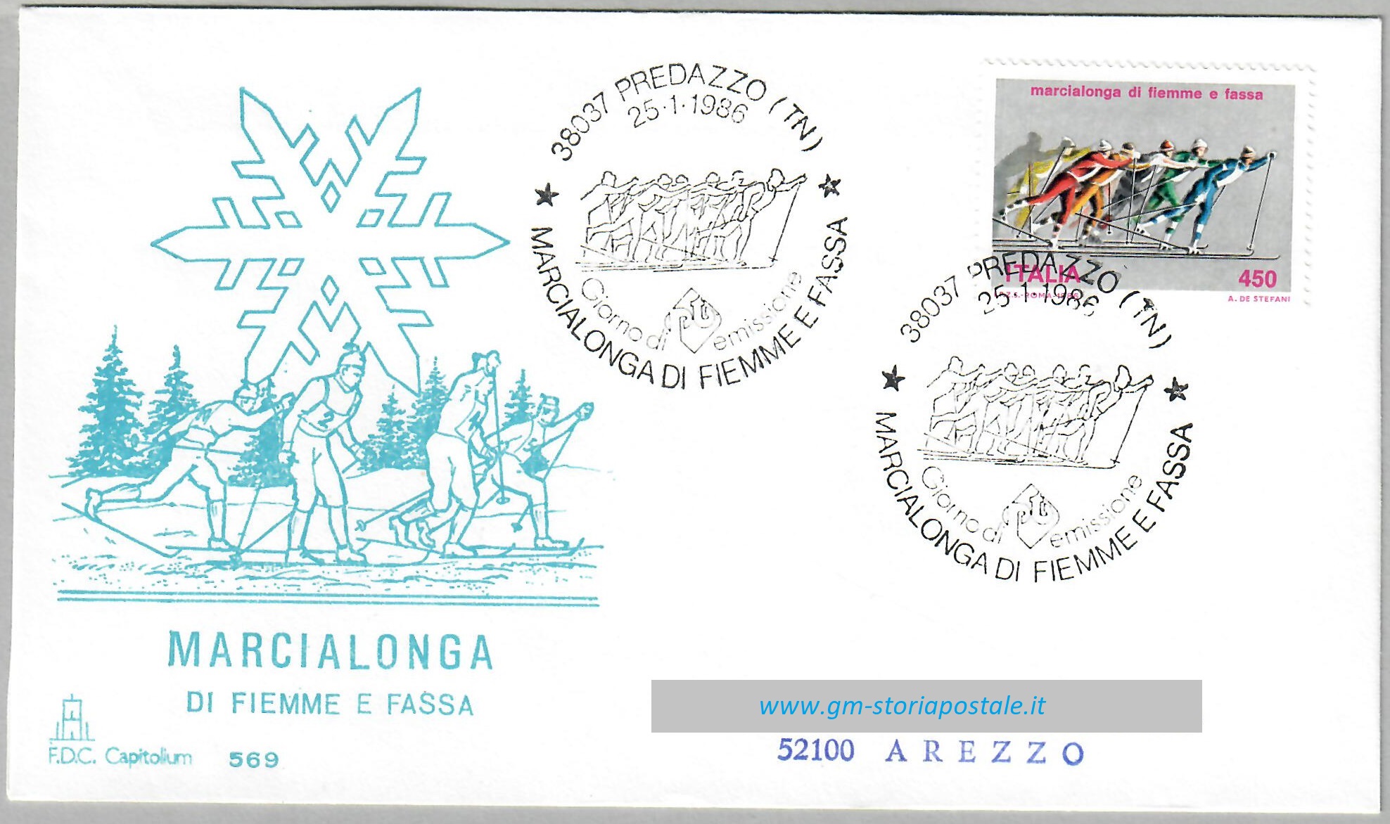 Il francobollo commemorativo da 450 lire dedicato alla Marcialonga di Fiemme e di Fassa su sci da fondo fu emesso il 25 gennaio 1986 con validità permanente. L’annullo speciale per il primo giorno di emissione fu in uso a Predazzo.