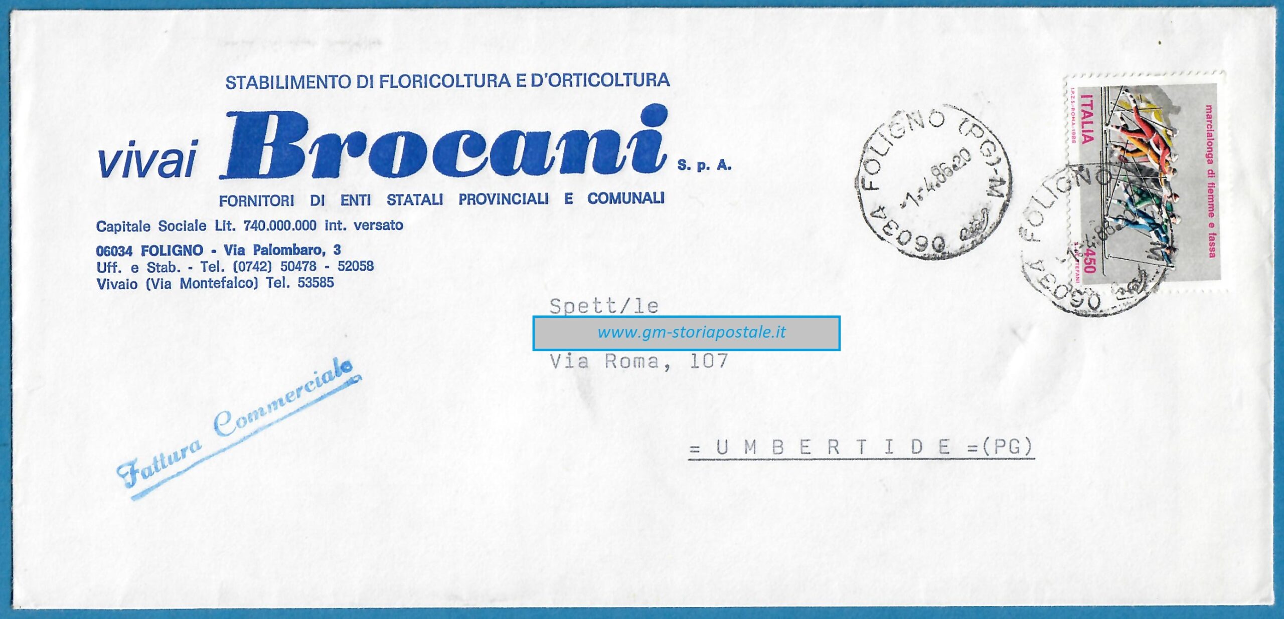 Tra il 13 novembre 1985 ed il 15 novembre 1986 la tariffa per affrancare una fattura commerciale aperta a tariffa intera (con località di destinazione diversa dalla località di origine) era di 450 lire. L’esemplare sotto riportato fu spedito da Foligno il 1° aprile 1986 per Umbertide, dove giunse il 3 aprile successivo.