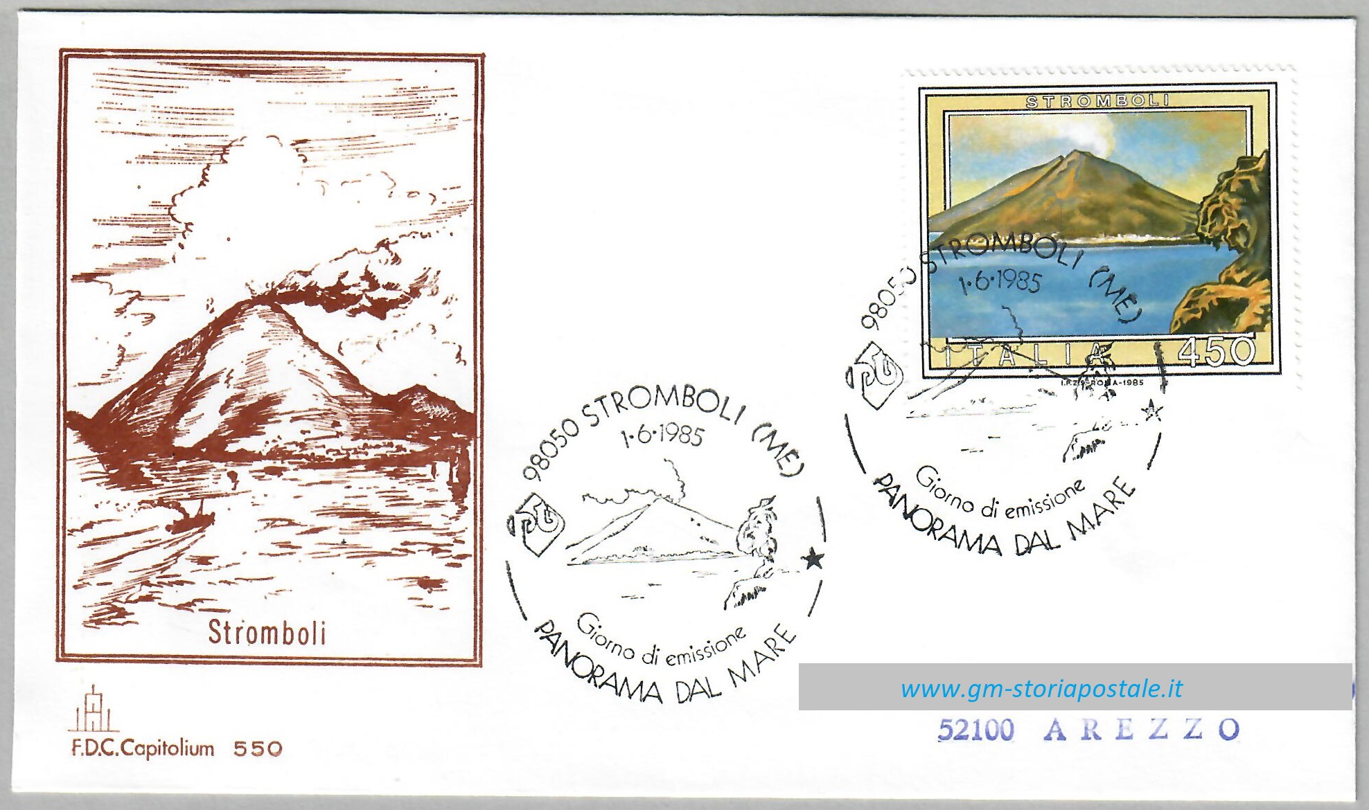 Il francobollo commemorativo da 450 lire dedicato a Stromboli, della serie turistica del 1985, fu emesso il 1° giugno 1985 con validità permanente. L’annullo speciale per il primo giorno di emissione fu in uso a Stromboli.