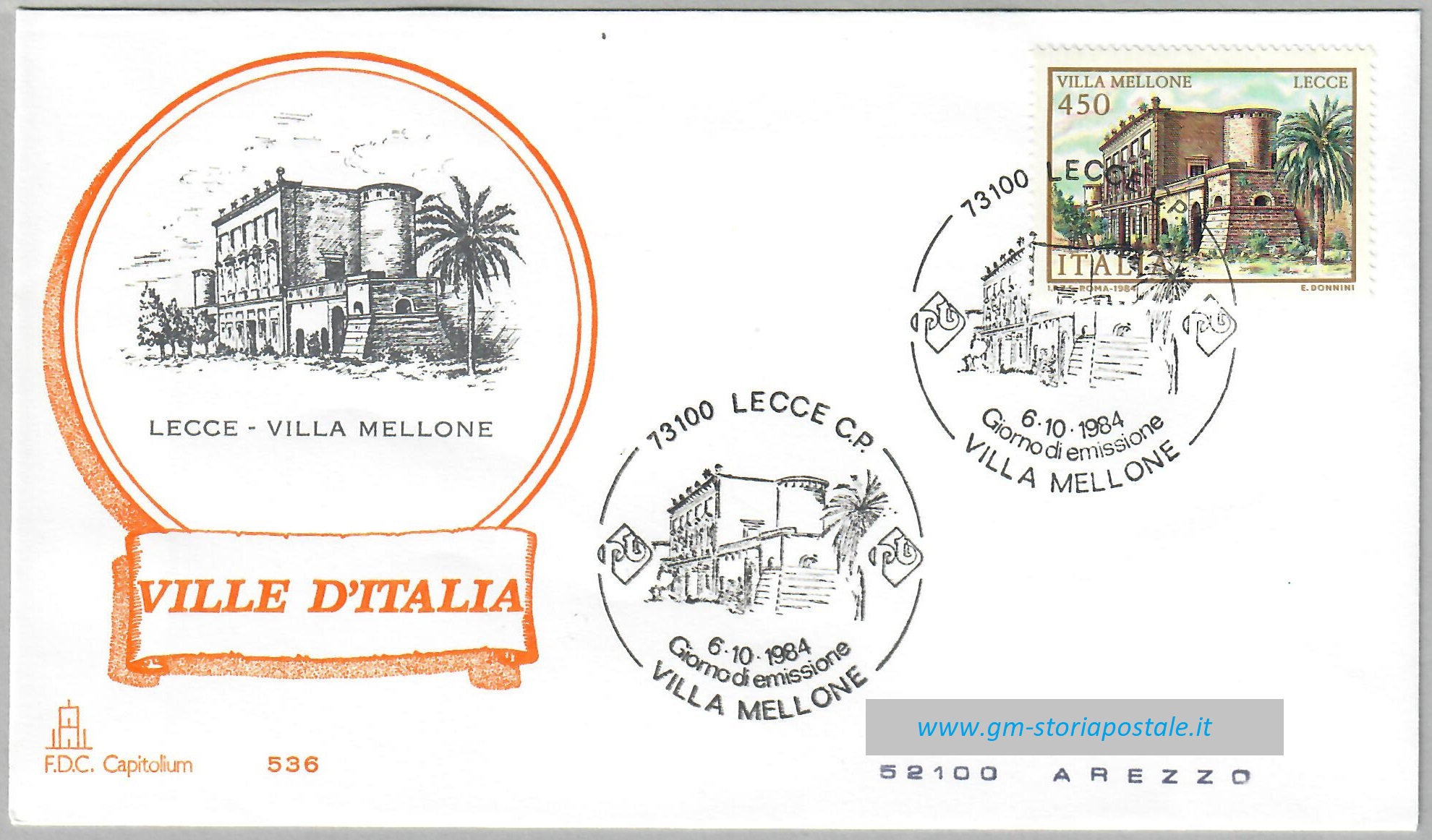 Il francobollo commemorativo da 450 lire della serie del 1984 dedicata alle ville d’Italia, raffigurante Villa Mellone a Lecce, fu emesso il 6 ottobre 1984 con validità permanente. L’annullo speciale per il primo giorno di emissione fu in uso a Lecce.