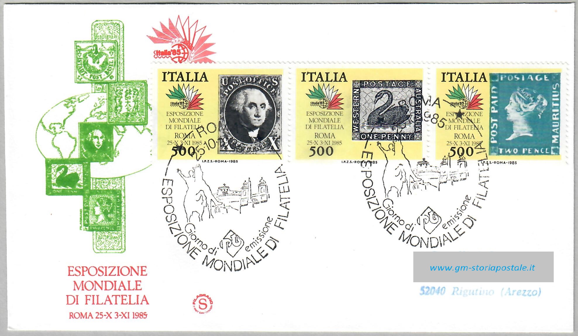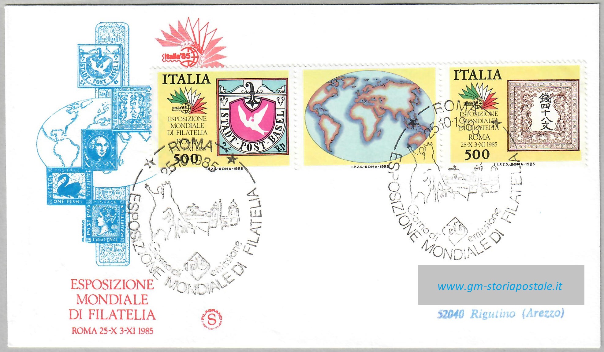Il foglietto di francobolli commemorativi “Francobolli dei cinque continenti”, costituito da cinque valori da 500 lire, fu emesso il 25 ottobre 1985 con validità permanente nell’ambito della manifestazione mondiale di filatelia “Italia ’85”. Ogni francobollo è dedicato ad un diverso continente e rappresenta un raro francobollo dell’area: una “Colomba di Basilea” per l’Europa, un “Black Swan” australiano per l’Oceania, un francobollo giapponese da 48 mon per l’Asia, un 10 cent statunitense per le Americhe ed il 2 pence Post Paid di Mauritius per l’Africa. L’annullo speciale per il primo giorno di emissione fu in uso a Roma.