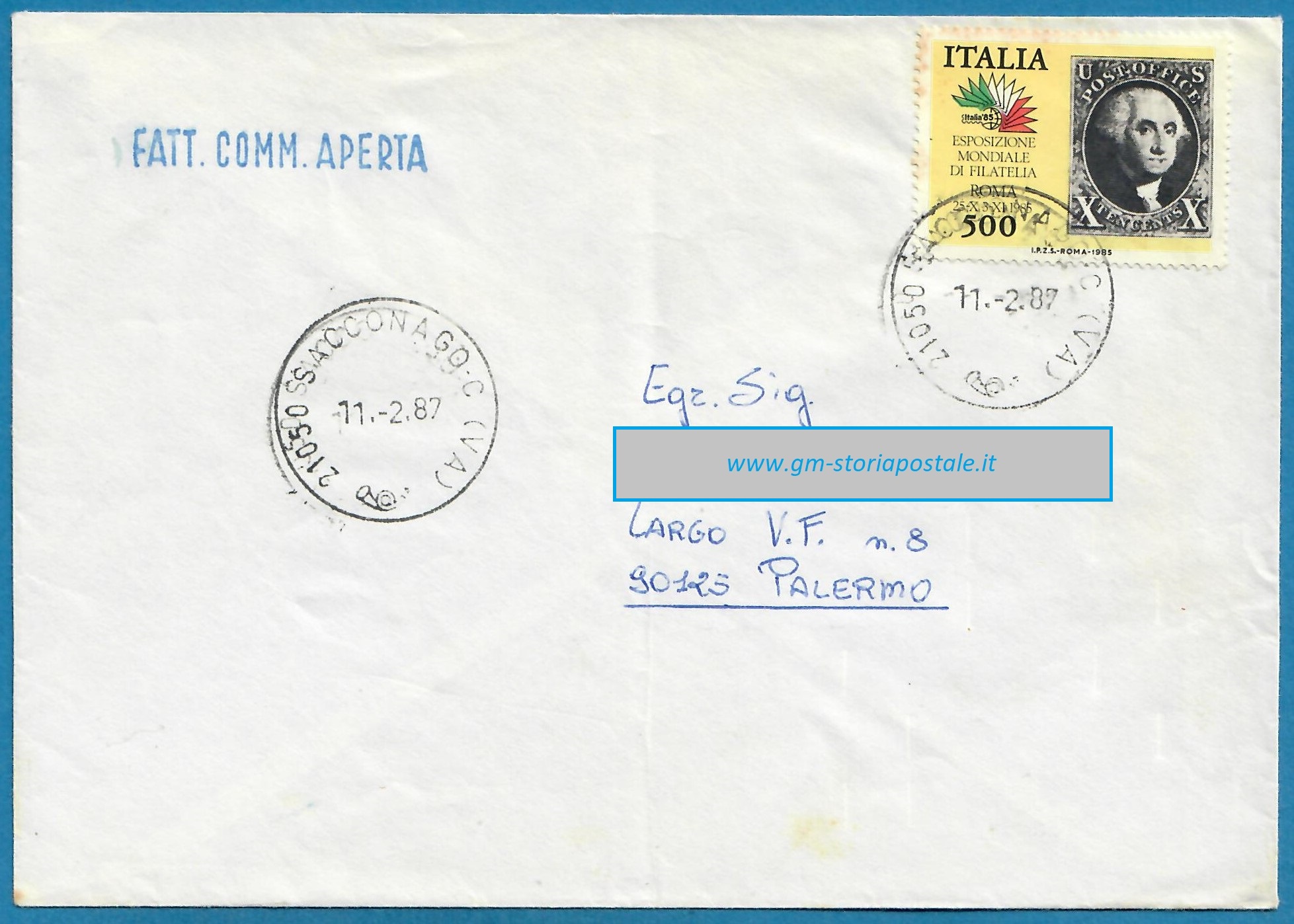 Tra il 16 novembre 1986 ed il 29 febbraio 1988 la tariffa per affrancare una fattura commerciale aperta era di 500 lire. L’esemplare sotto riportato fu spedito da Sacconago l’11 febbraio 1987 per Palermo.