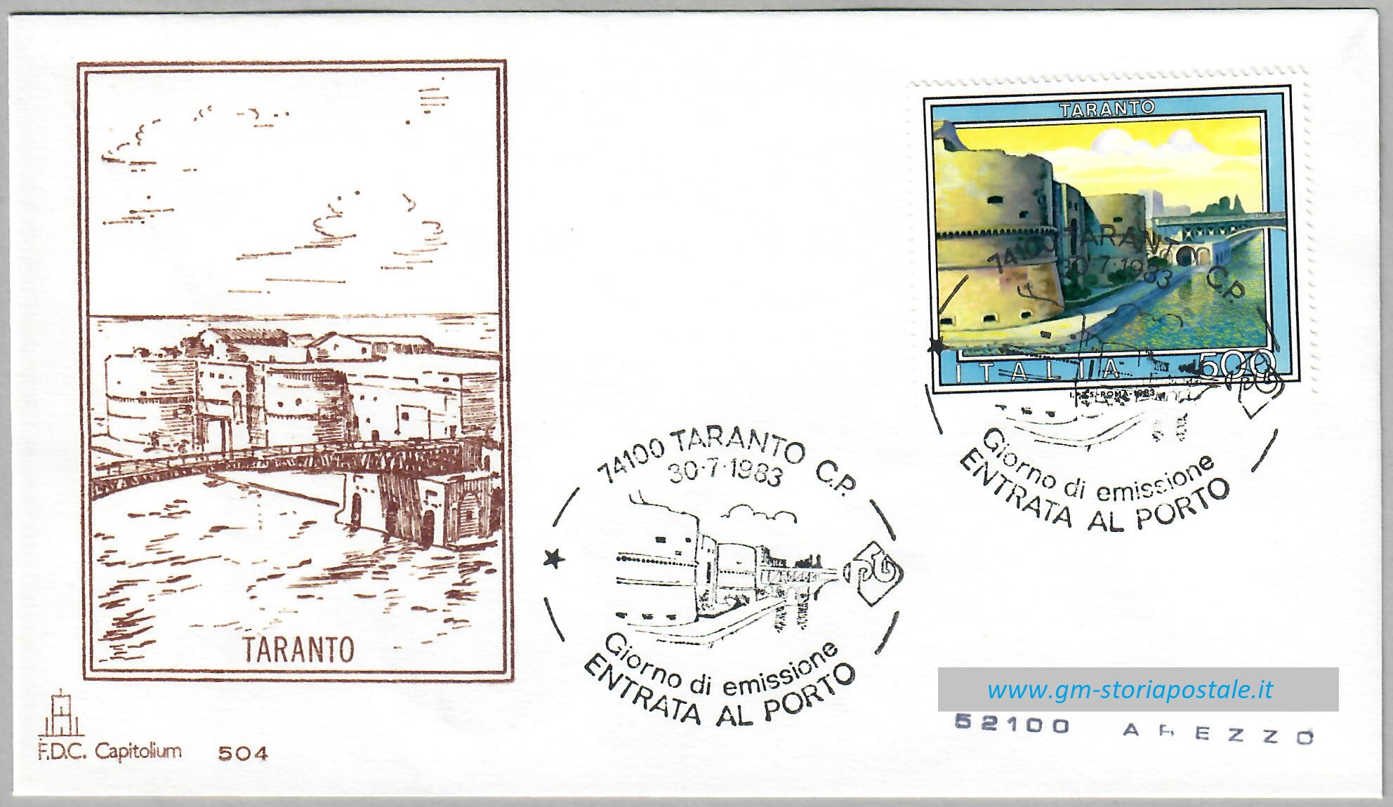 Il francobollo commemorativo da 500 lire dedicato a Taranto, della serie turistica del 1983, fu emesso il 30 luglio 1983 con validità permanente. L’annullo speciale per il primo giorno di emissione fu in uso a Taranto.