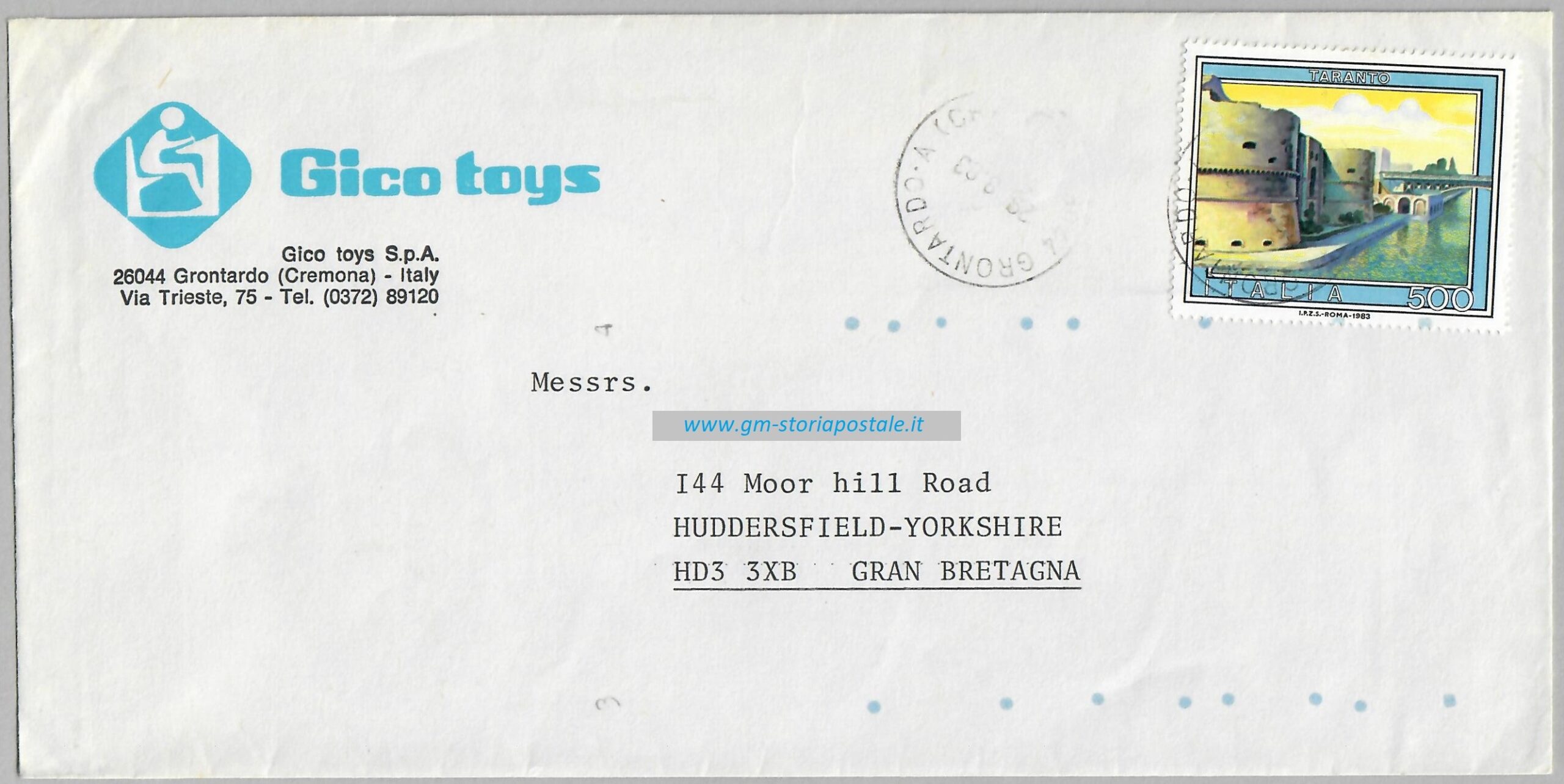 Tra il 1° gennaio 1983 ed il 31 dicembre 1983 la tariffa per affrancare una lettera primo porto per l’estero era di 500 lire. L’esemplare sotto riportato fu spedito da Grontardo il 29 agosto 1983 per il Regno Unito.