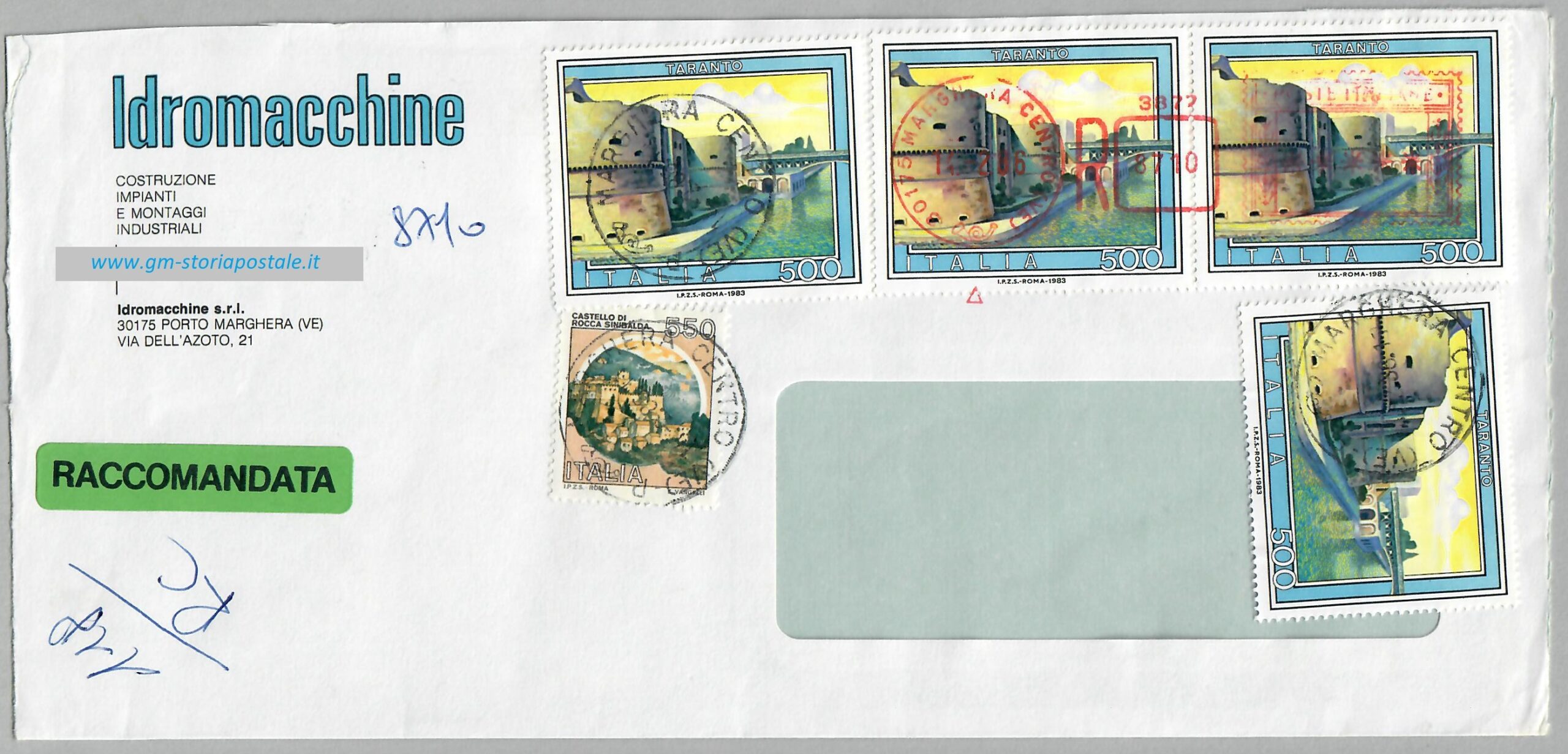 Tra il 13 novembre 1985 ed il 15 novembre 1986 la tariffa per affrancare una lettera primo porto per l’interno era di 550 lire e nello stesso periodo la soprattassa per la raccomandazione ammontava a 2000 lire: la lettera primo porto raccomandata si affrancava pertanto con 2550 lire. L’esemplare sotto riportato fu spedito da Marghera il 14 febbraio 1986 per Venezia, dove giunse il 17 febbraio successivo.