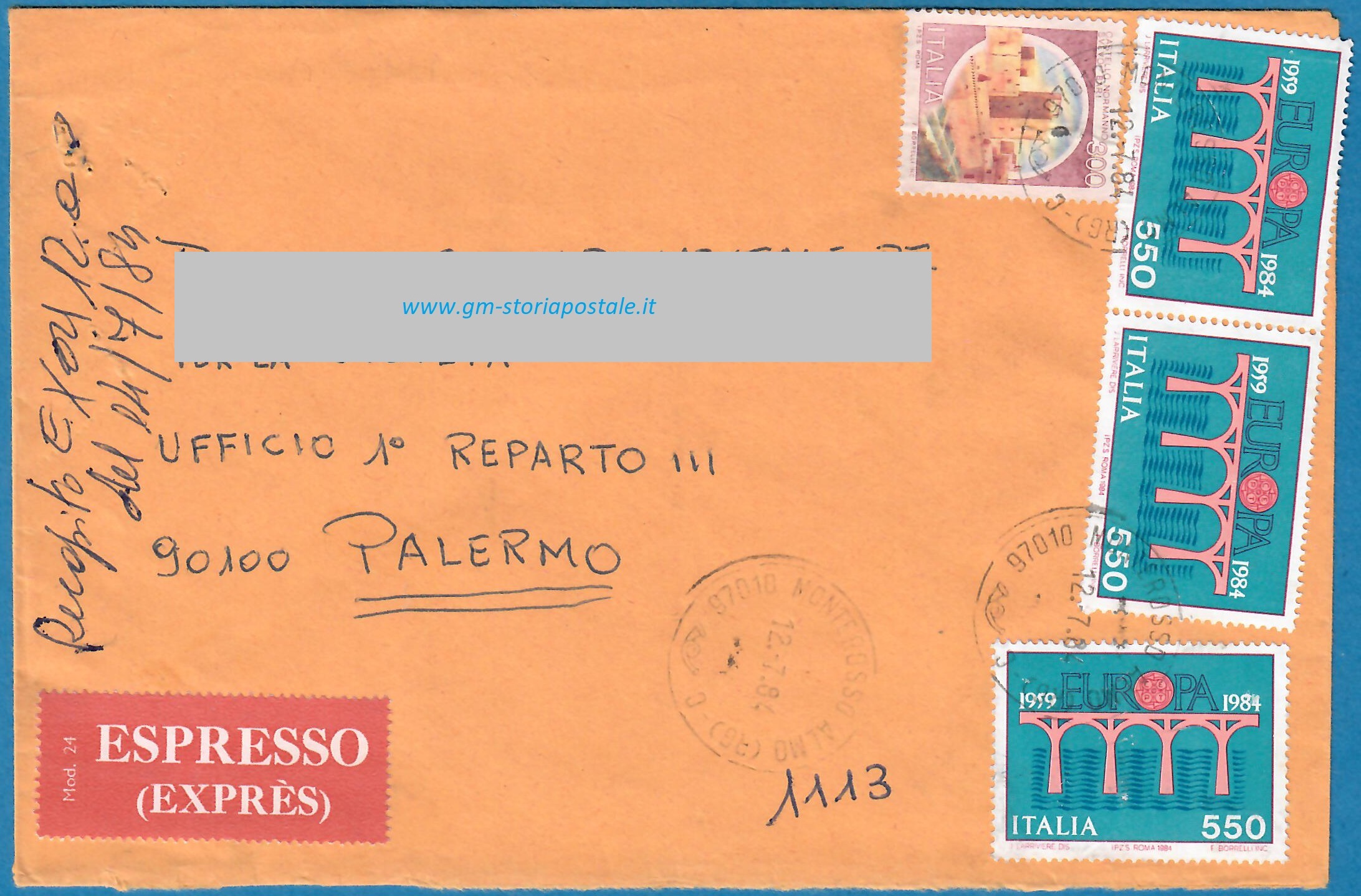 Tra il 1° giugno 1984 ed il 12 novembre 1985 la tariffa per affrancare una lettera primo porto per l’interno era di 450 lire, mentre la soprattassa per il recapito espresso era di 1500 lire: la lettera primo porto espresso si affrancava pertanto con 1950 lire. L’esemplare sotto riportato fu spedito da Monterosso Almo il 12 luglio 1984 per Palermo, dove giunse il 14 luglio successivo.